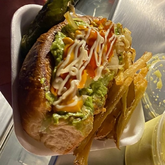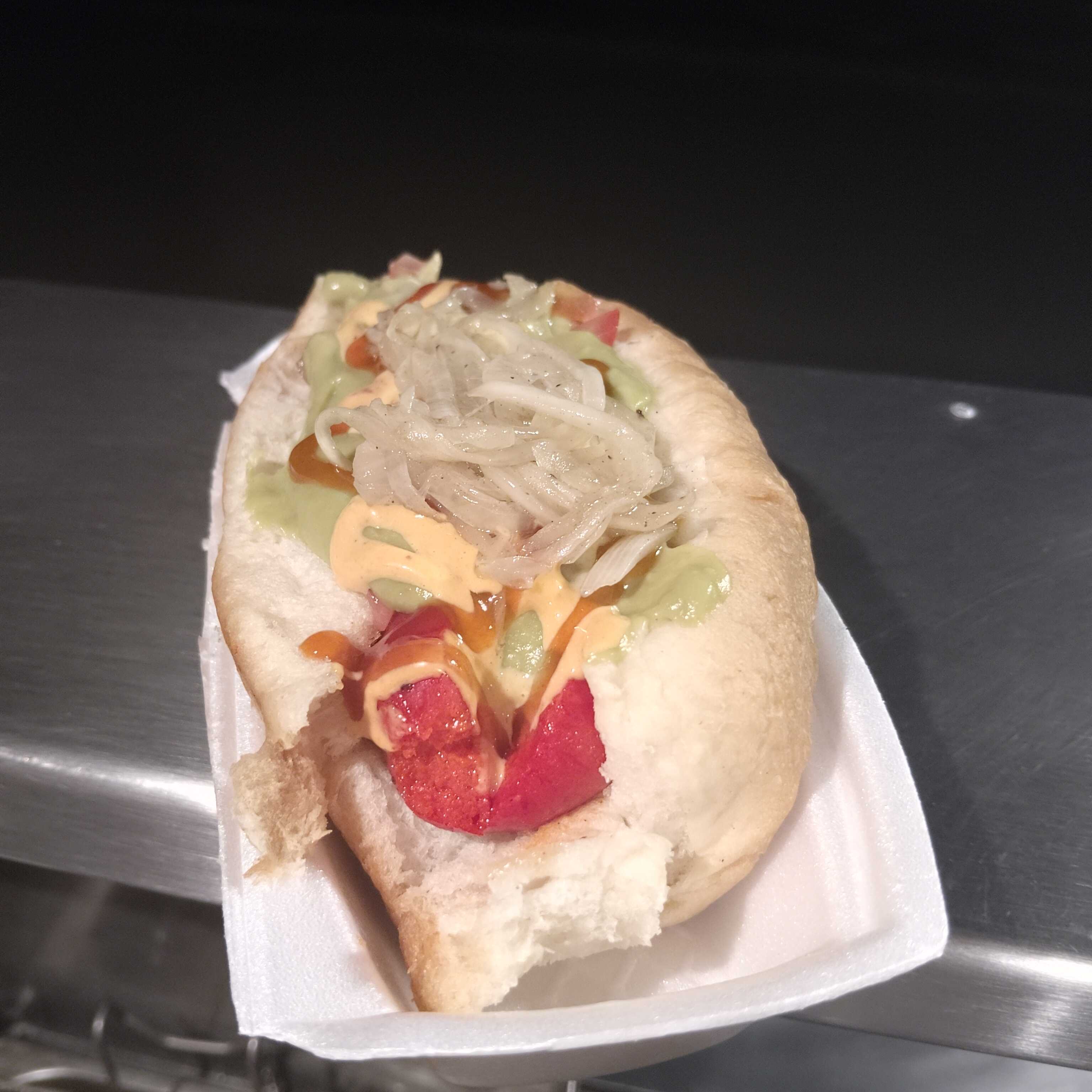 Pan, salchicha para asar con una salchicha normal adentro envuelta en tocino, lechuga, tomate, cebolla, cebolla guisada, guacamole, aderezos (mayonesa, chipotle, cheez wish)