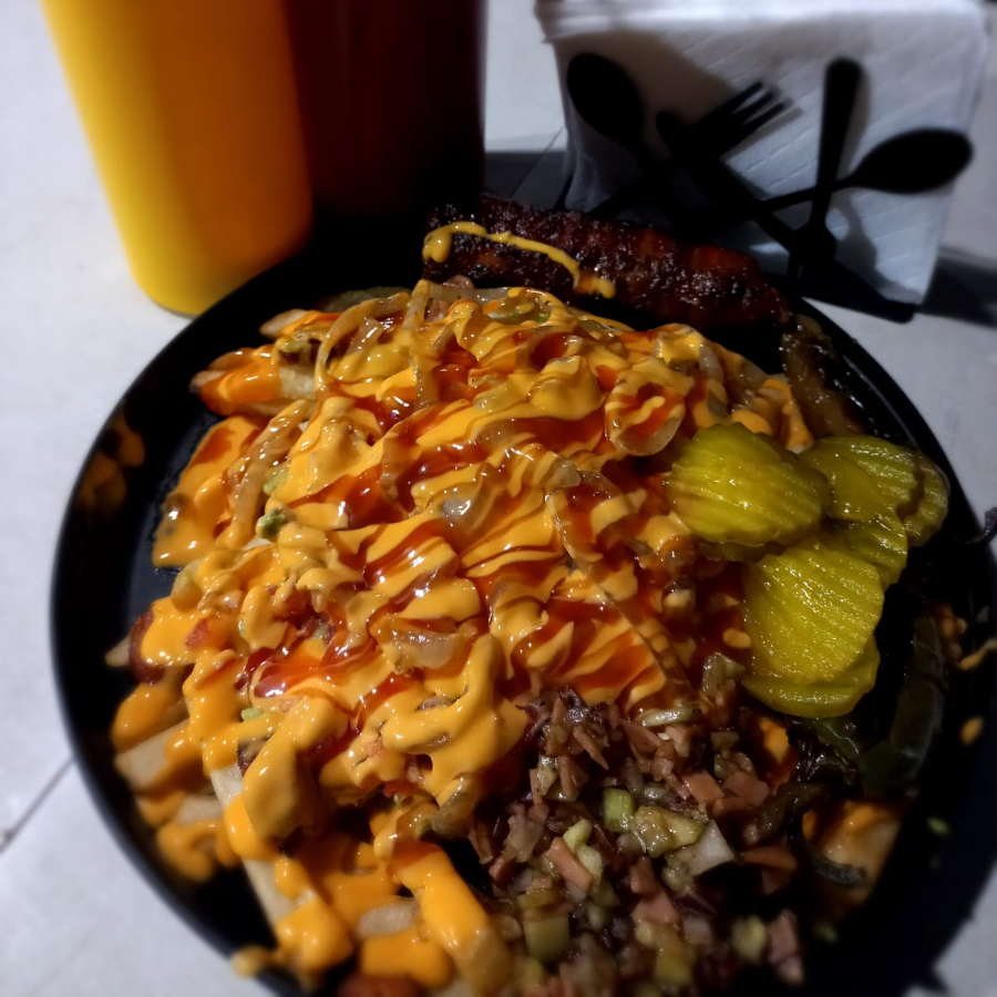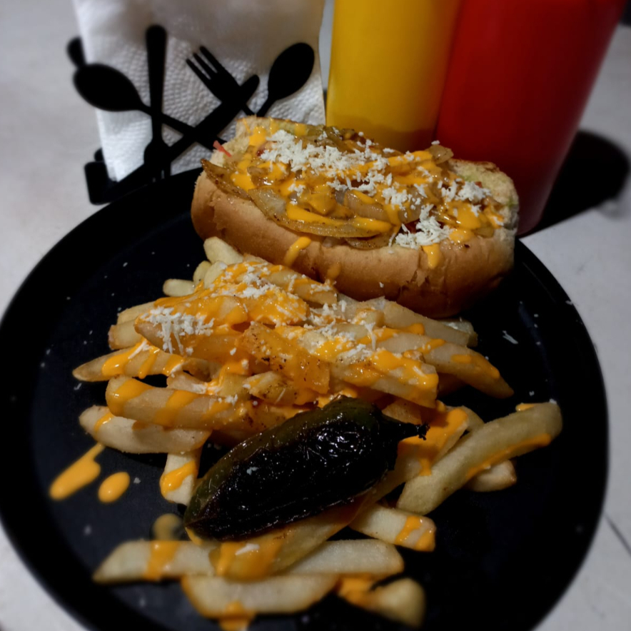 1 orden de papas ala francesa con salchicha de su eleccion,verduras y aderesos