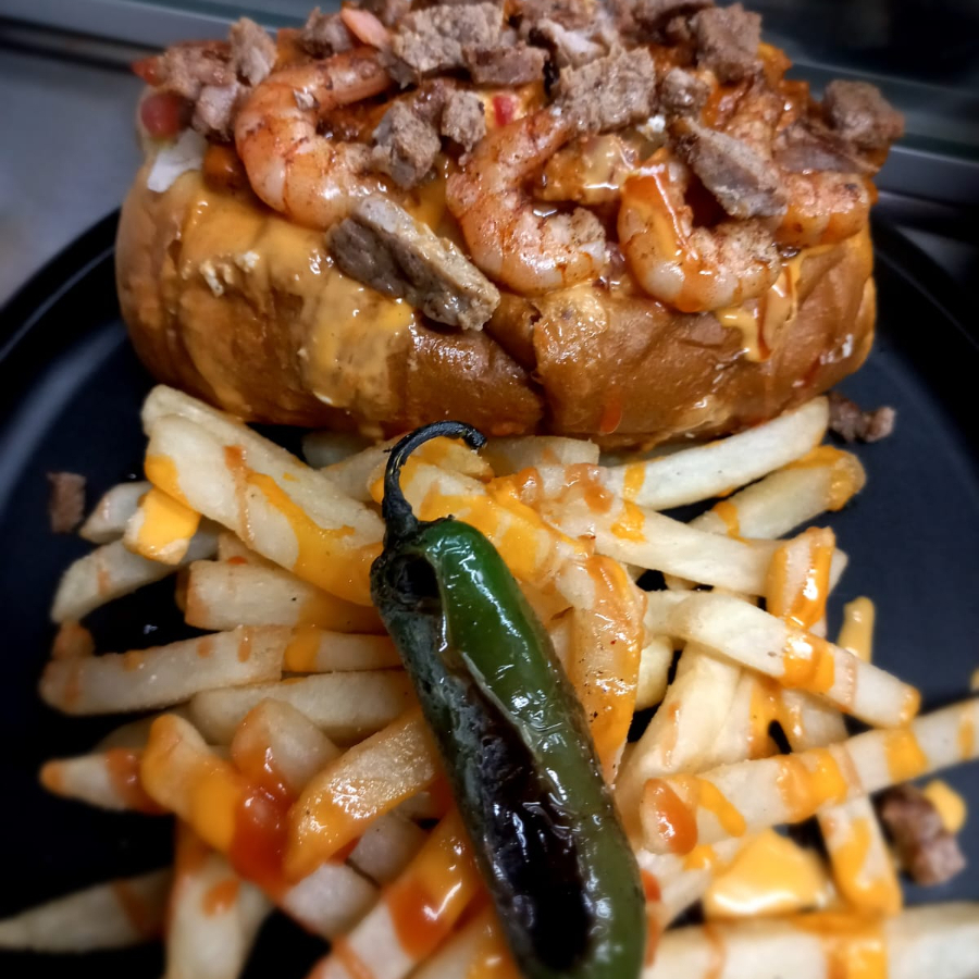 camaron y carne asada con queso gratinado, salchicha envuelta con tocino, jamon y queso, en pan suave,verduras y aderesos
