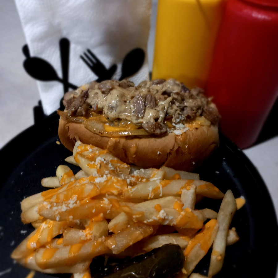 carne asada gratinada con queso, salchicha envuelta con tocino,jamon y queso, en pan suave,verduras y aderesos