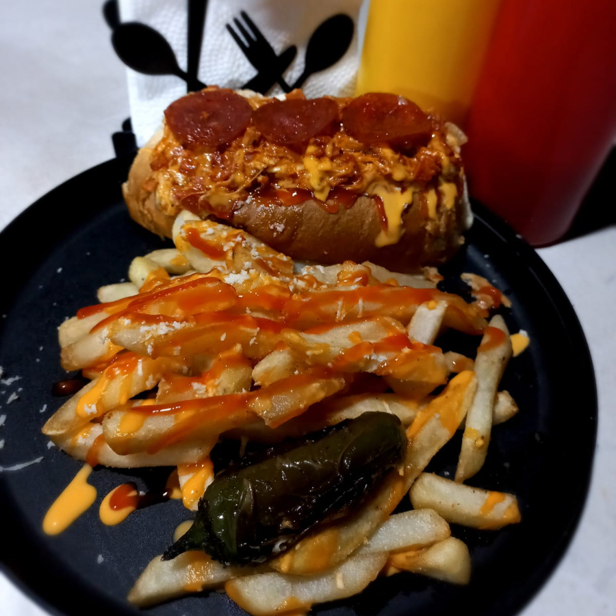 jamon y salami en salsa de tomate en queso gratinado con peperoni,salchicha envuelta con tocino, jamon y queso, en pan suave,verduras y aderesos
