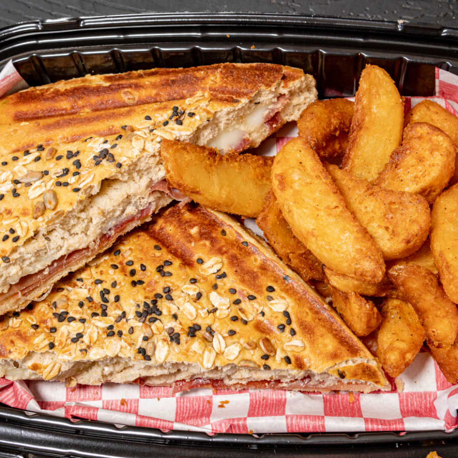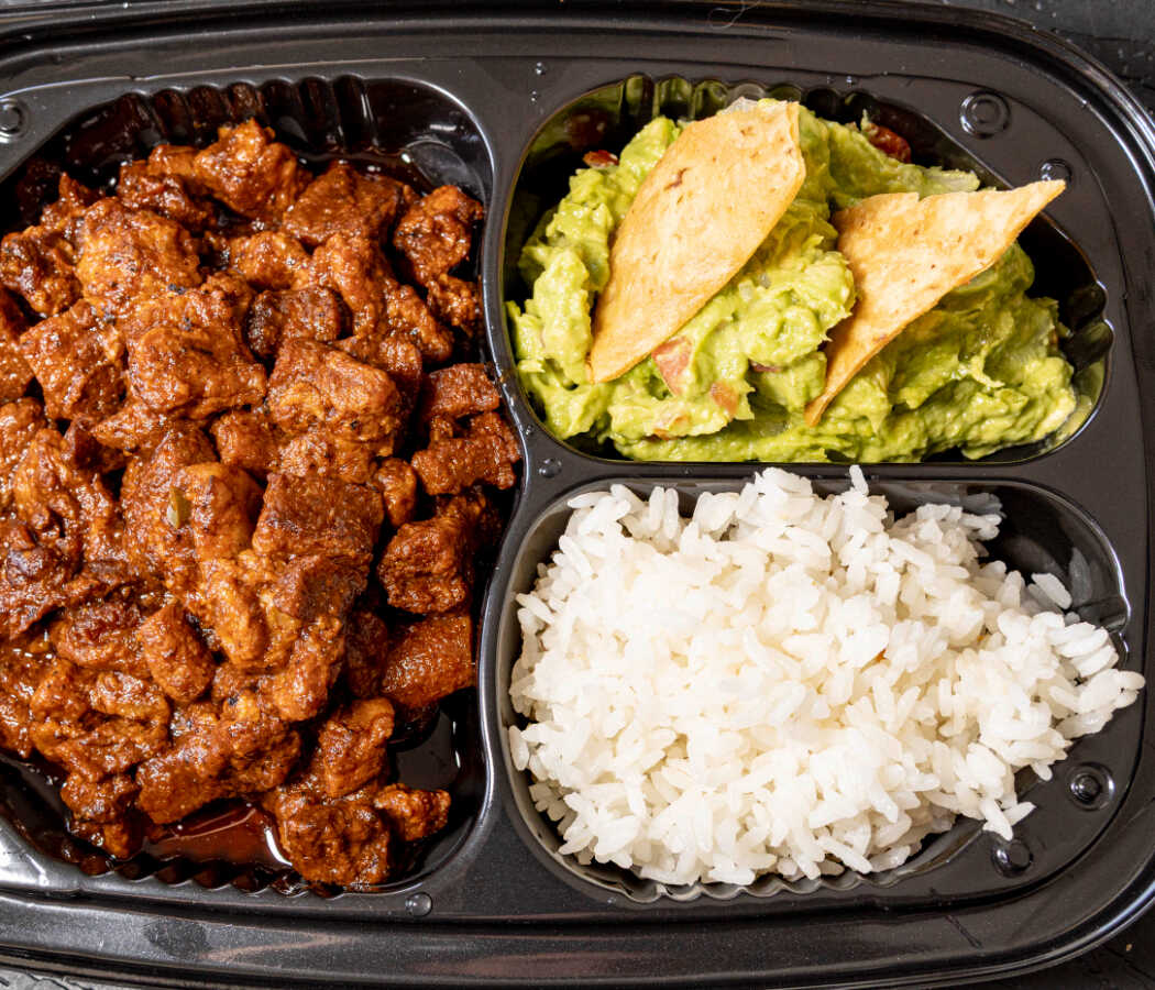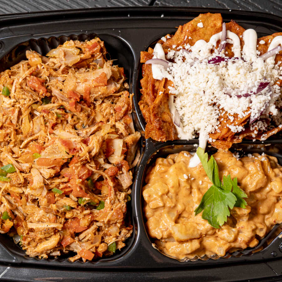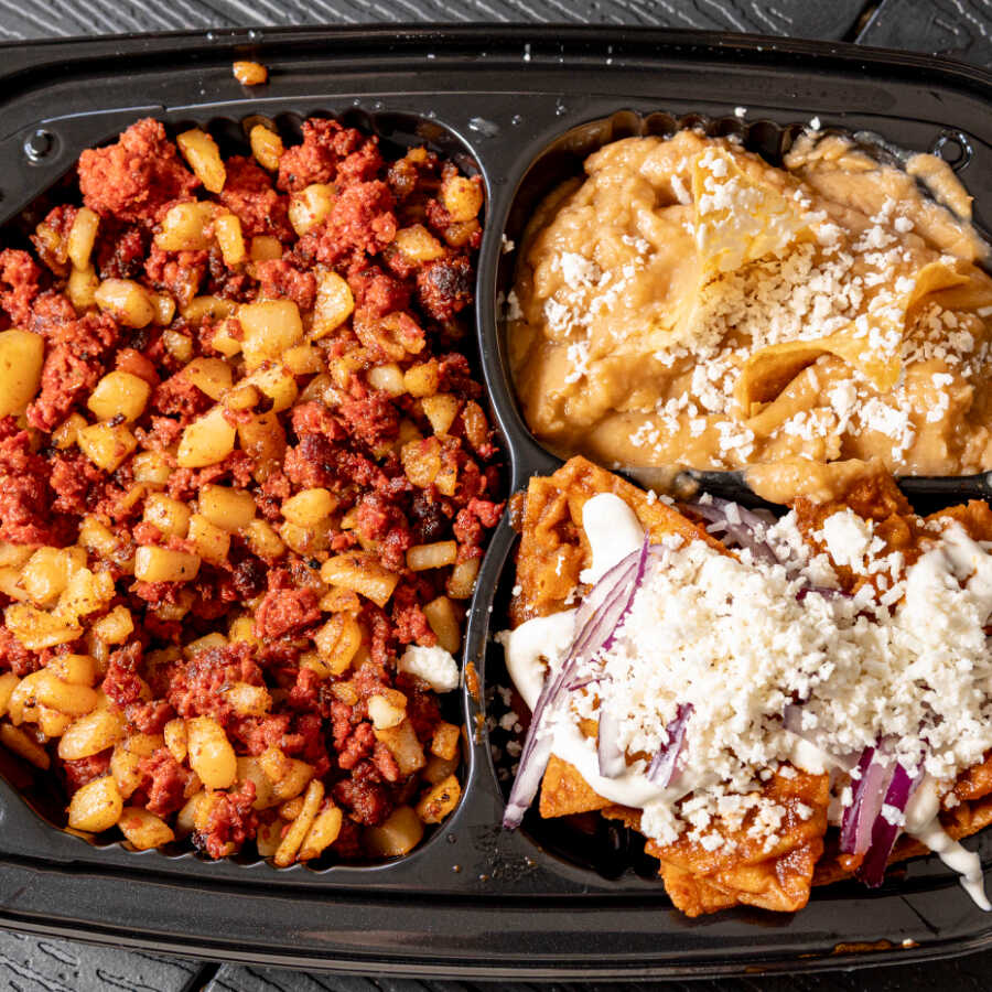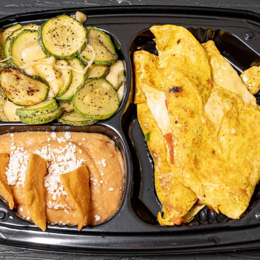 Huevos revueltos con proteína y 2 guarniciones a elegir