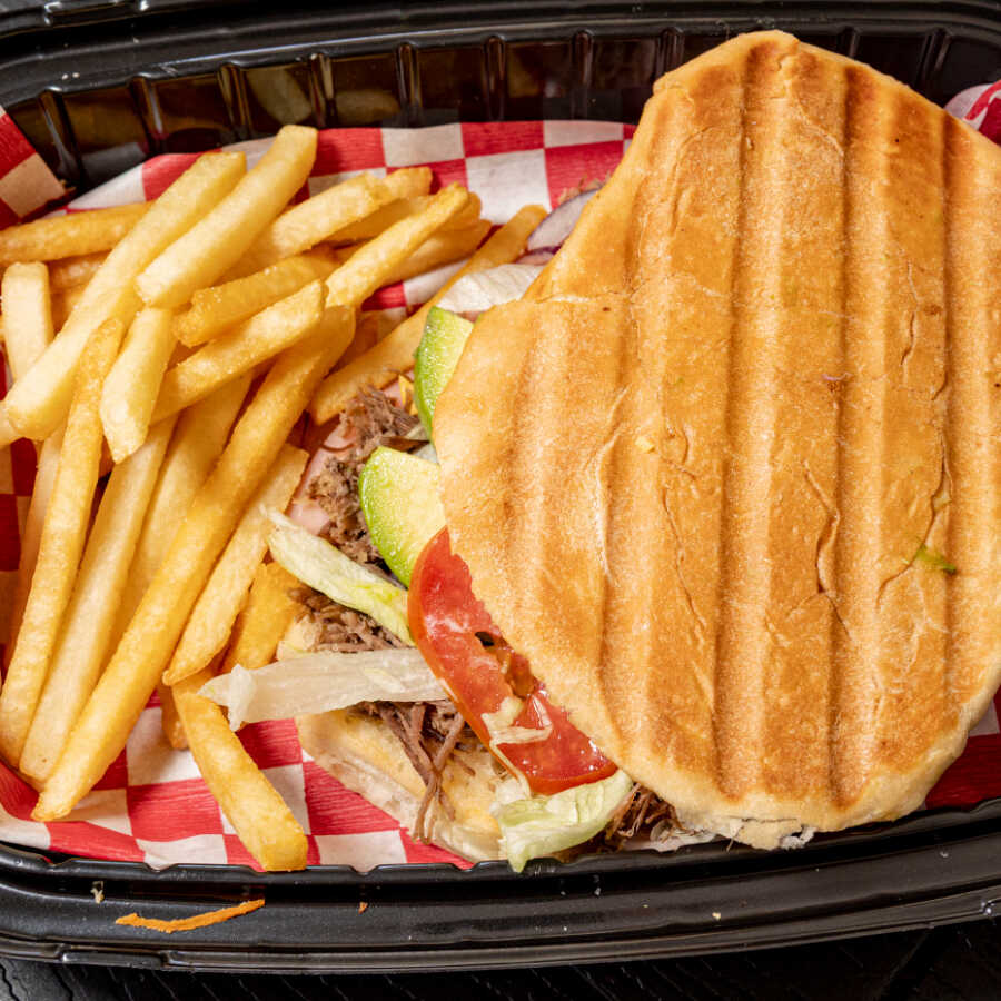 Torta Cochinita de aguacate, lechuga, tomate, cebolla, y chiles
