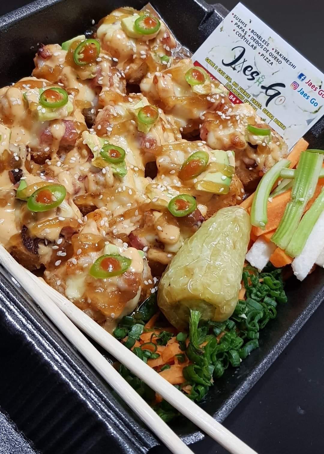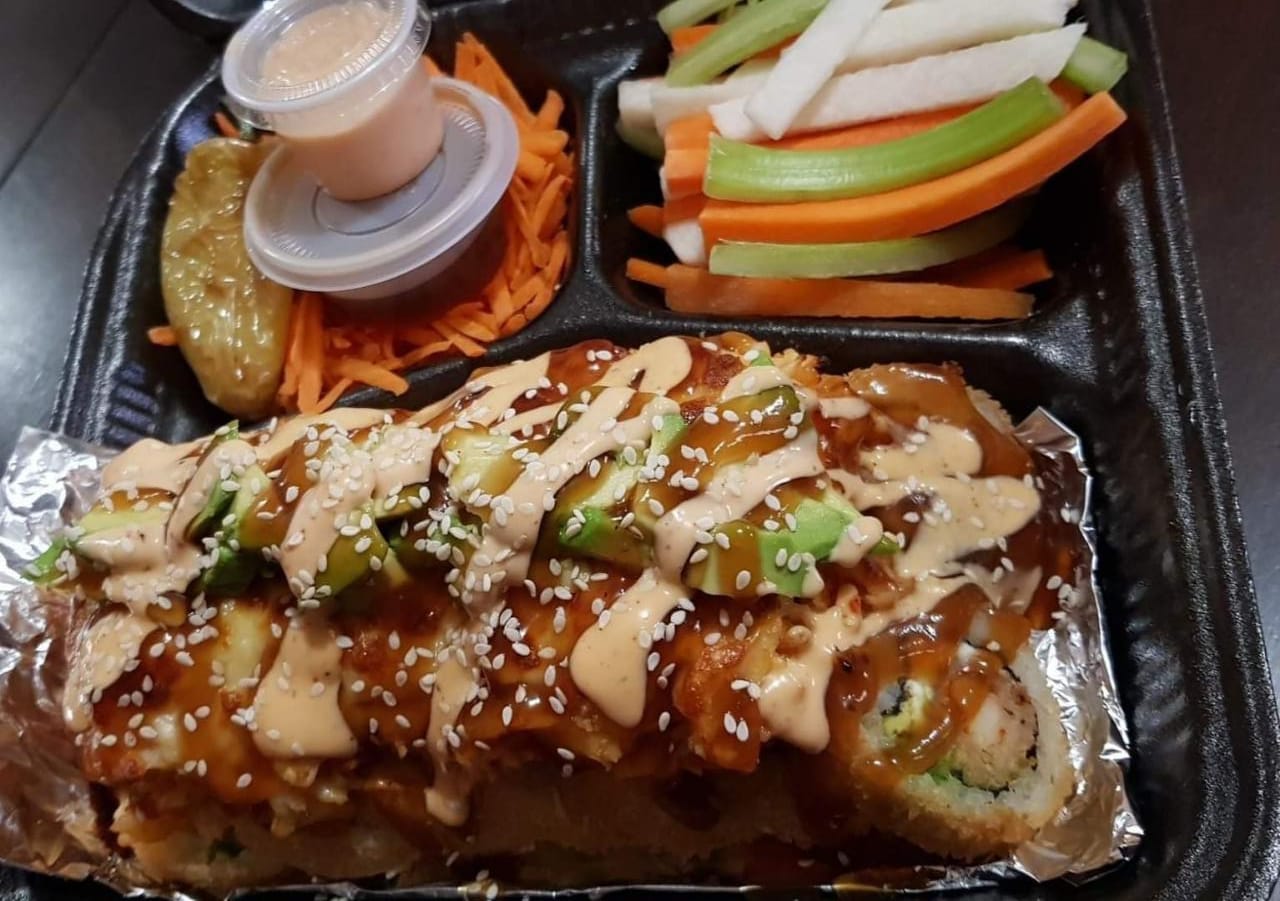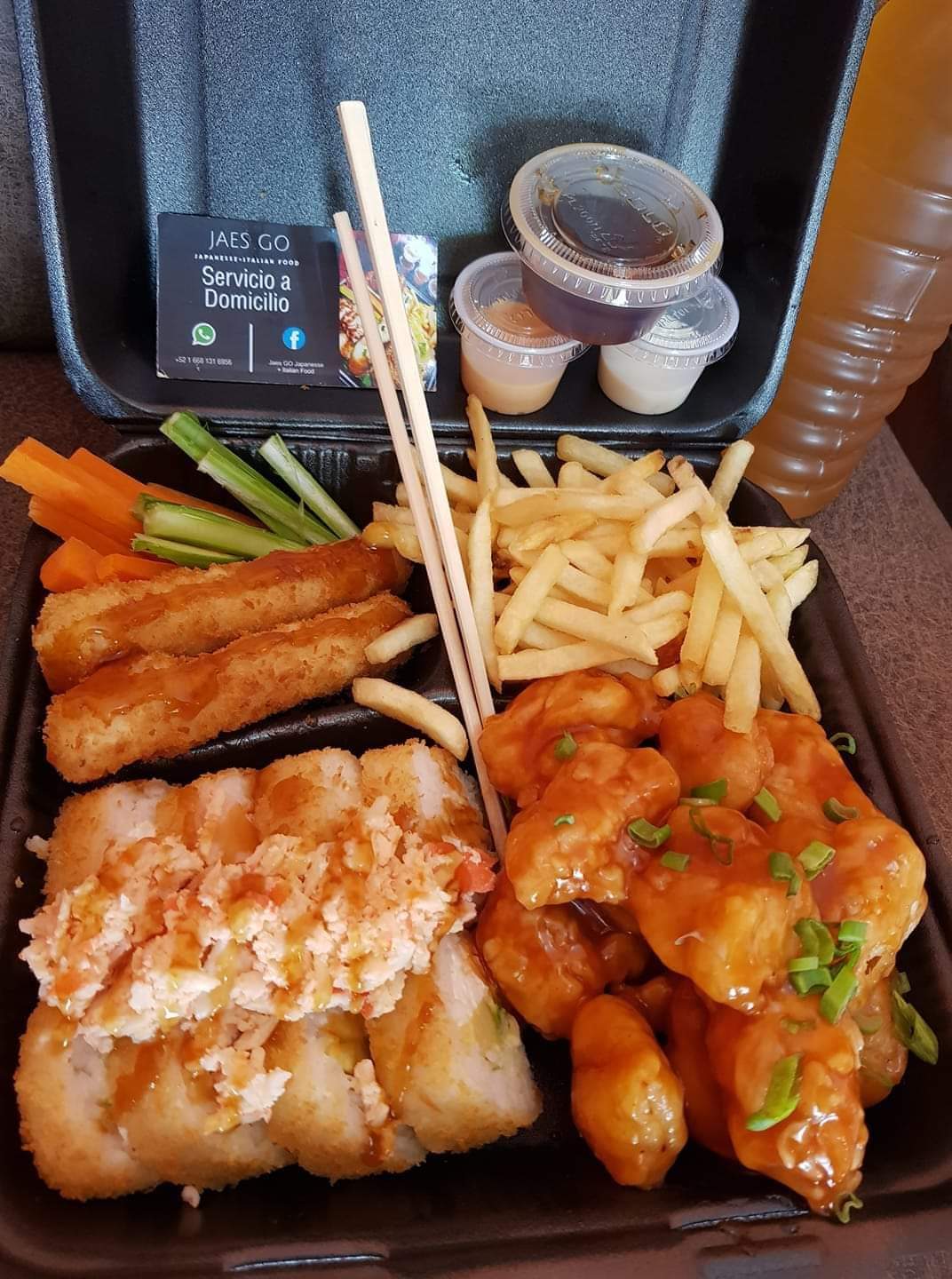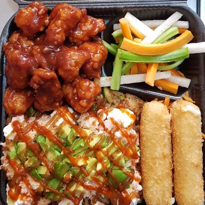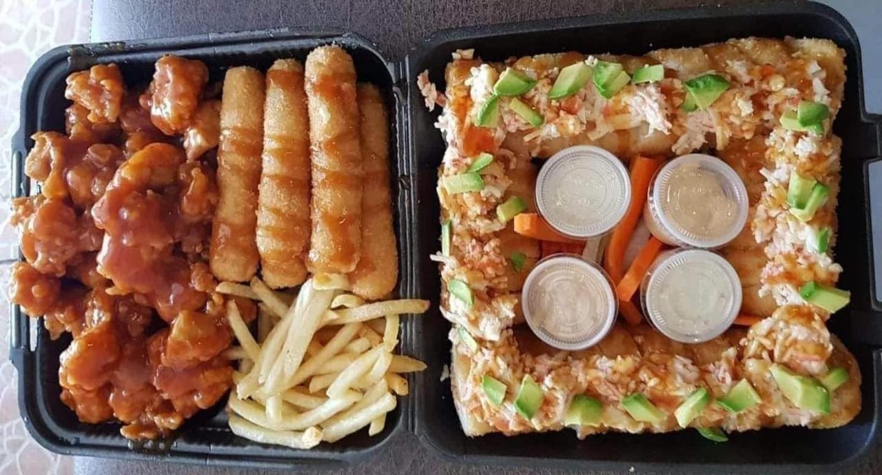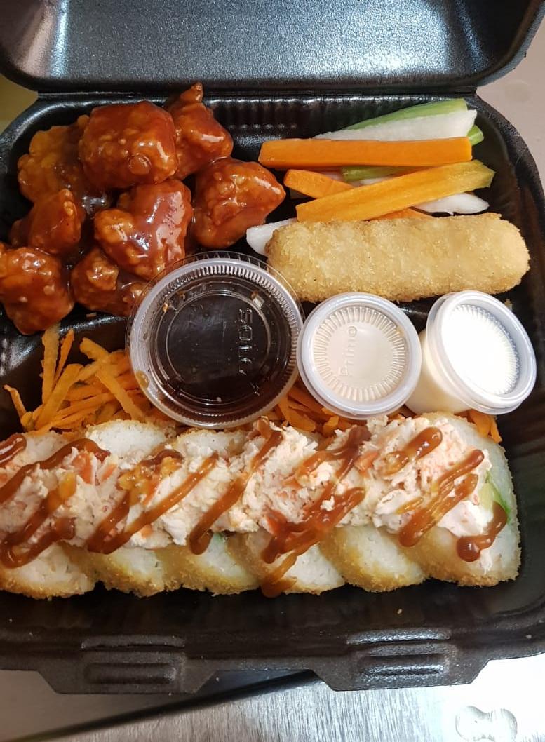 10 Pz de sushi, 1/2 orden de yakimeshi de vegetales, 2 dedos de queso, 12 pz de boneless y 1 lt de té.
