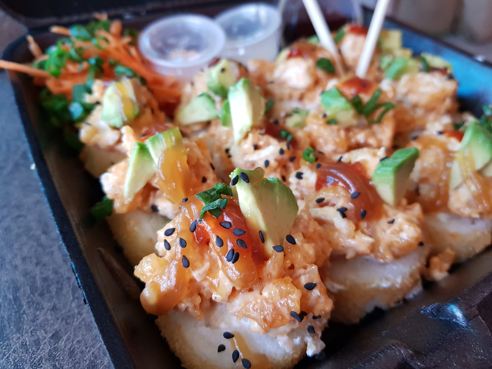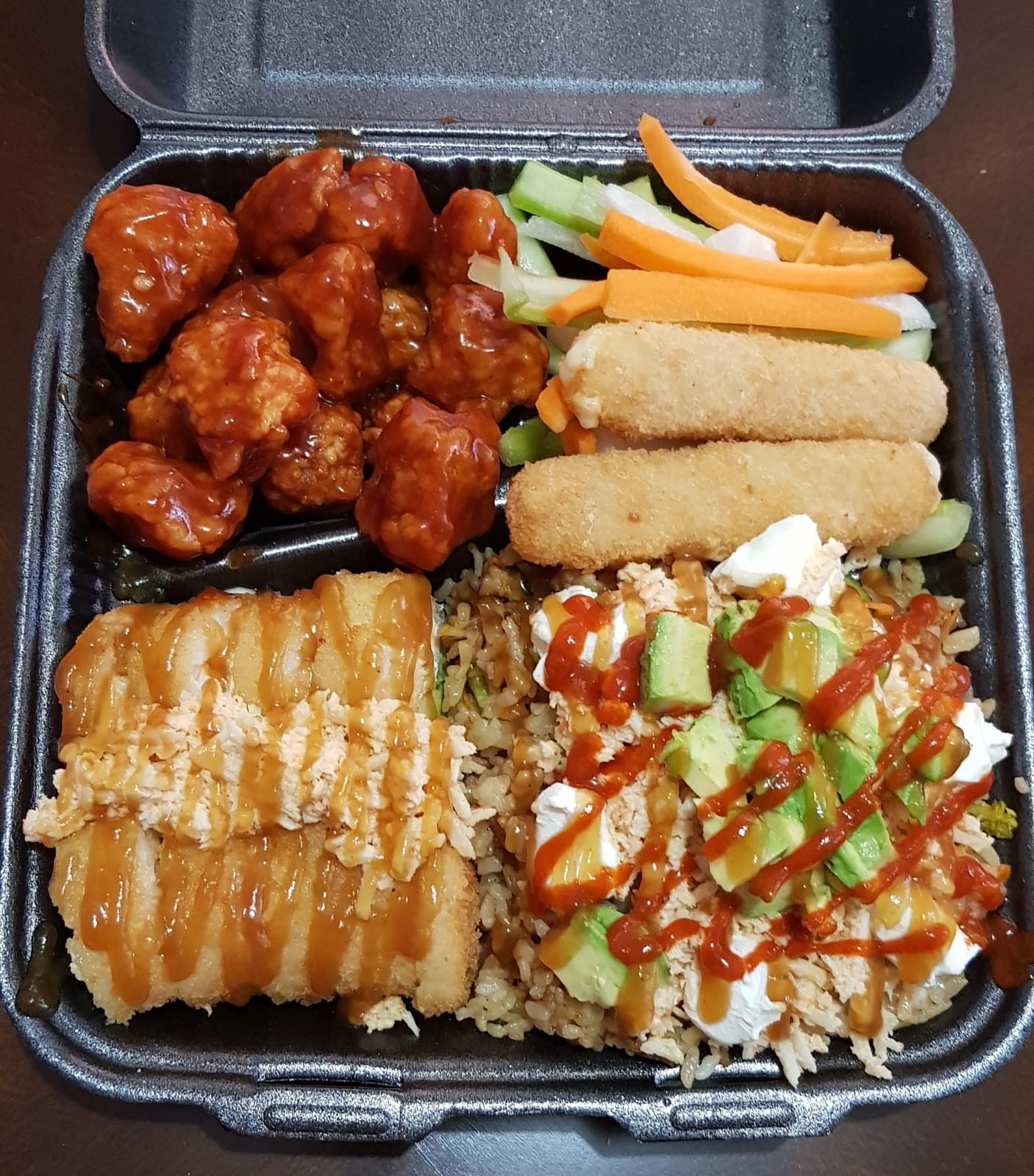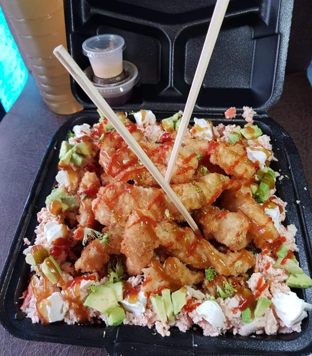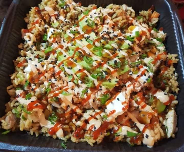Proteína empanizada de pollo o camarón. Base arroz frito acompañado de ensalada de surimi, aguacate y Philadelphia bañado en bastante salsa de anguila