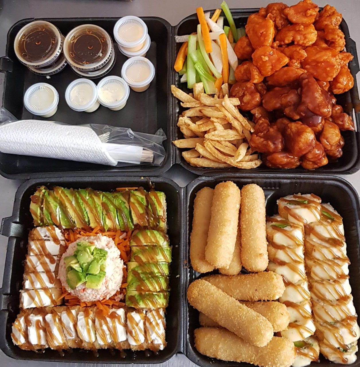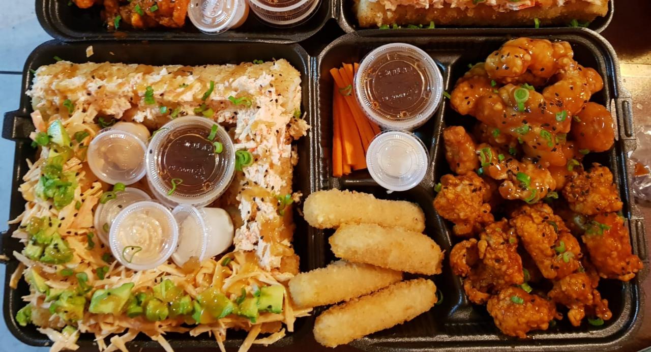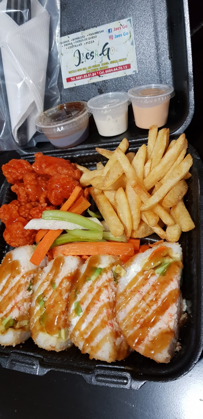 44 Pz de sushi, 50 pz de boneless, 8 dedos de queso, 1 orden de papas y 2 lt de té.