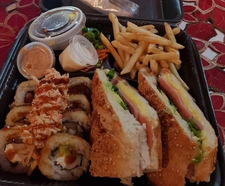 8 Pz de sushi, 20 cm baguette de jamón, 1/2 orden de papas y 1/2 lt de té.