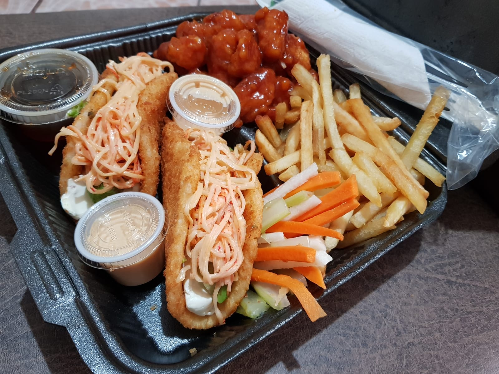 Dos tacos de surimi, 12 pz de boneless, 1/2 orden de papas y 1/2 lt de té.