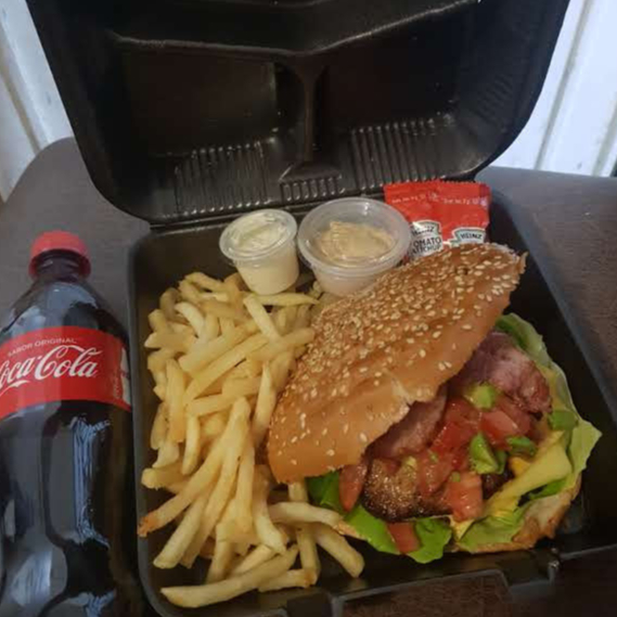 Hamburguesa 150 mg tocino guacamole especial de la casa y lechuga con papa gajo o francesa y mayonesa catsup y moztasa y coca cola.