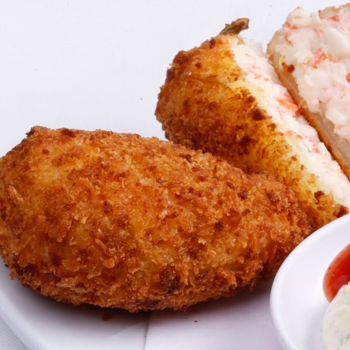 Relleno de camarón empanizado, philadelphia, aguacate con topping de camarón empanizado y surimi spicy. (10 pzas)