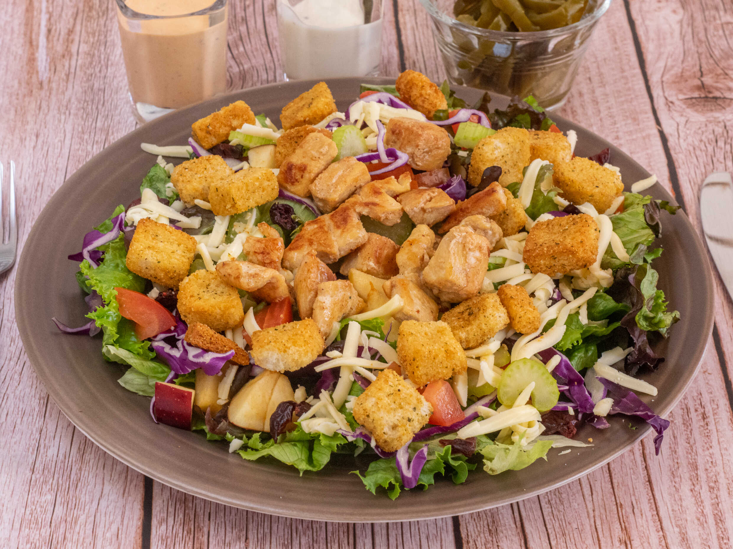 Mix de lechugas, pechuga de pollo, tomate, pepino, manzana verde, col morada, apio, arándanos, queso Chihuahua, crotones, y aderezo.