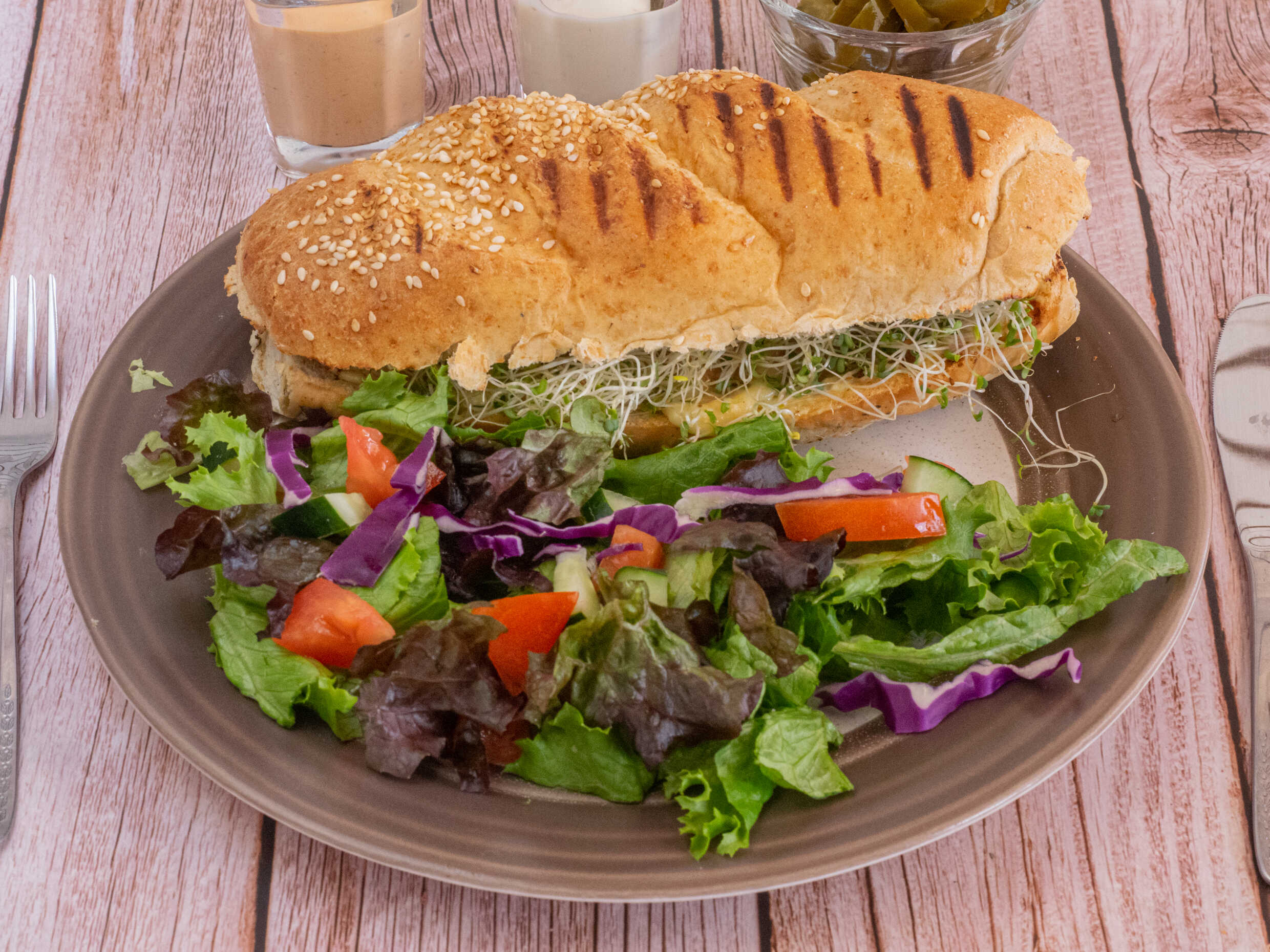 Pan, pechuga de pollo, germinado, cebolla, queso Chihuahua, acompañado de una ensalada.