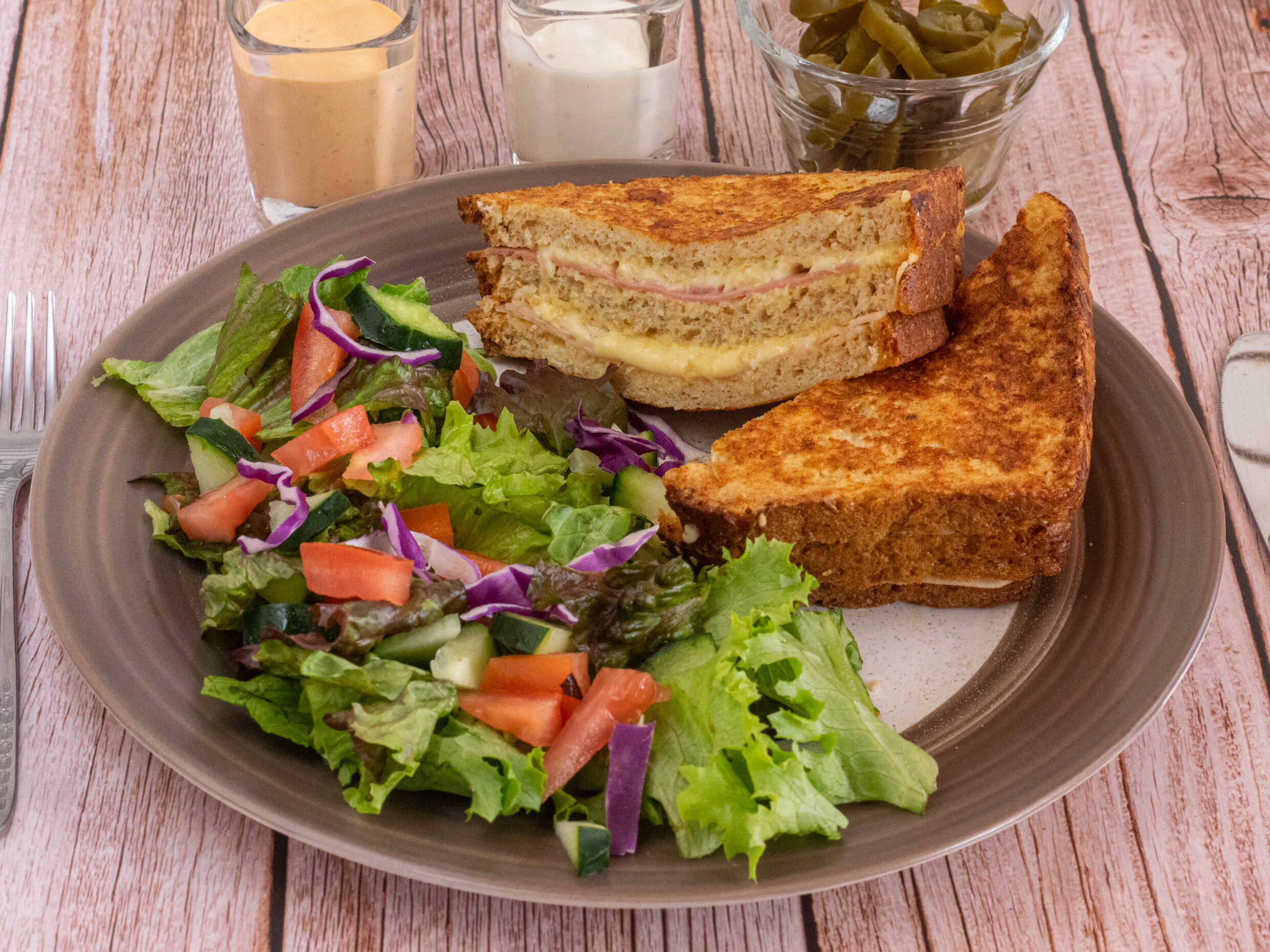 Pan de caja, huevo, queso Chihuahua, pechuga de pavo, jamón y acompañado de una ensalada.