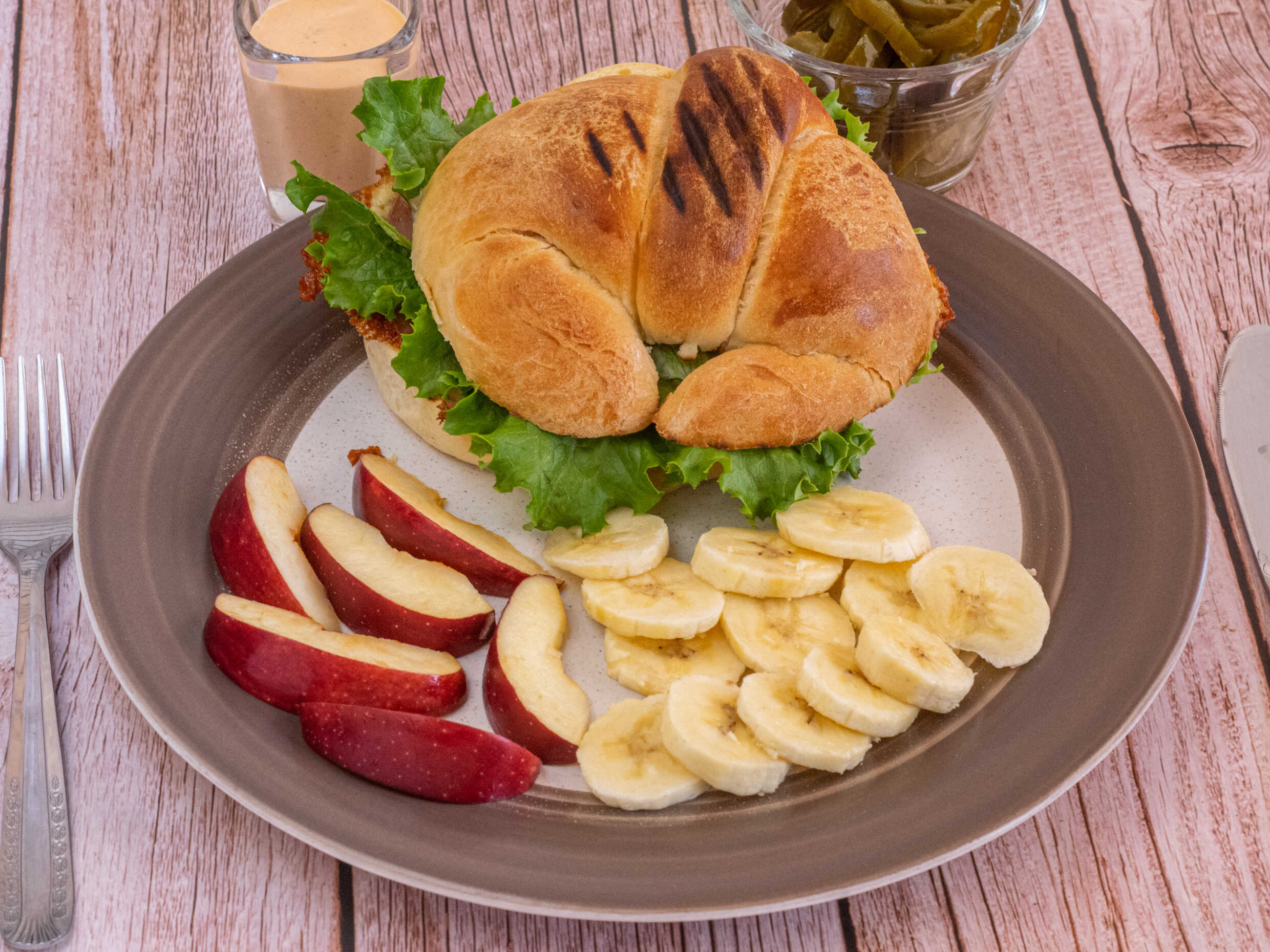 Pechuga de pollo, quesos, lechuga, tomate, cebolla, aguacate, col morada, acompañado de un mix de frutas.