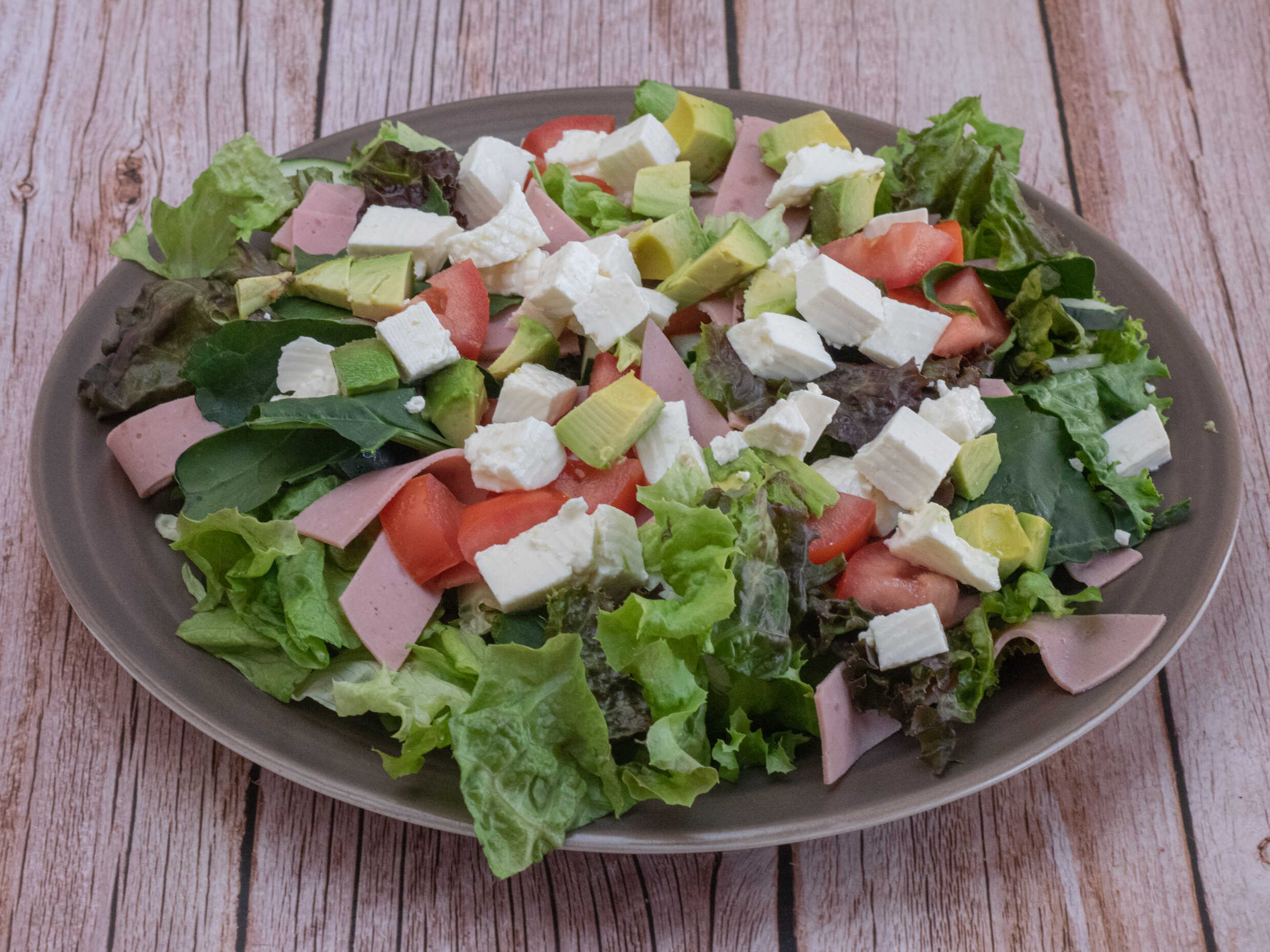 Mix de lechuga, espinaca, pepino, aguacate, tomate, jamón y panela.