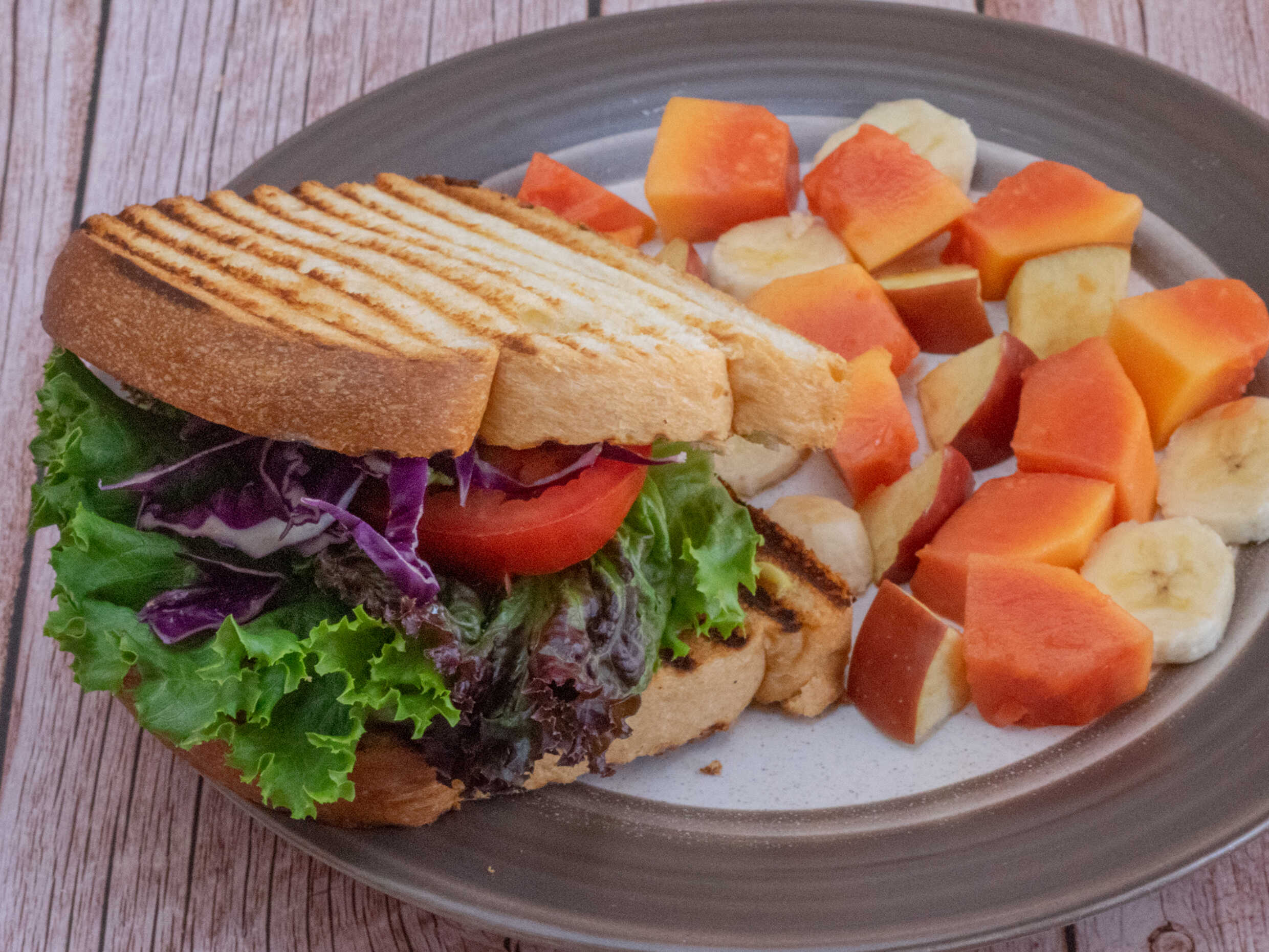 Jamón, quesos, lechuga, tomate, cebolla, aguacate, col morada, acompañado de un mix de frutas.