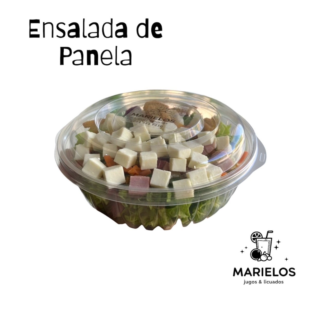 (lechuga, zanahoria rayada, pepino, manzana verde, arándano, nuez, jamón, panela y crotones)