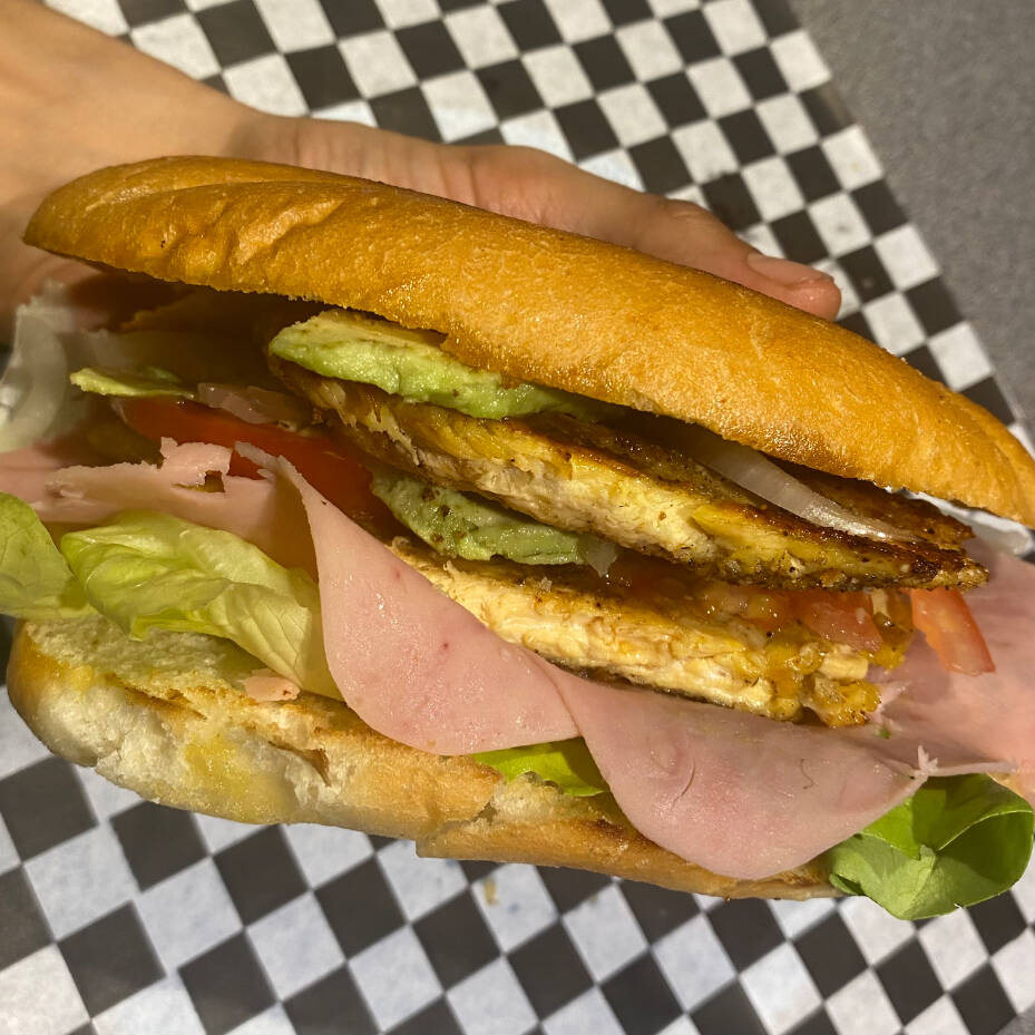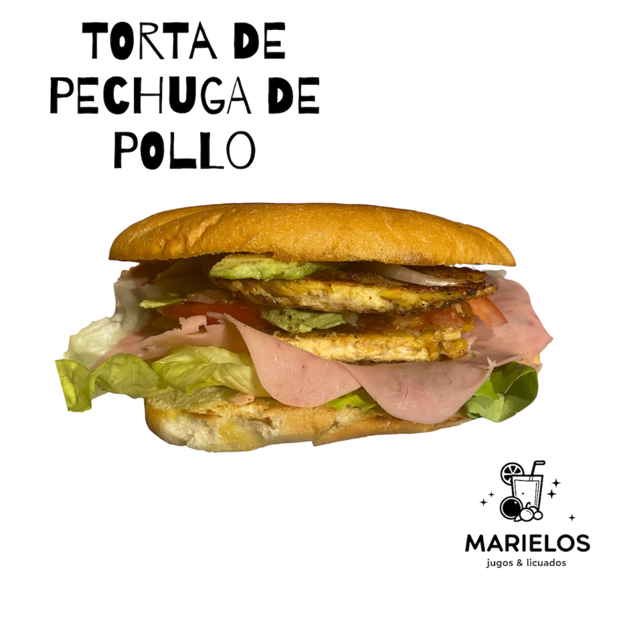 Doble porción de pechuga de pollo acompañada de Lechuga, tomate, cebolla, aguacate, jamón, mantequilla y mayonesa.