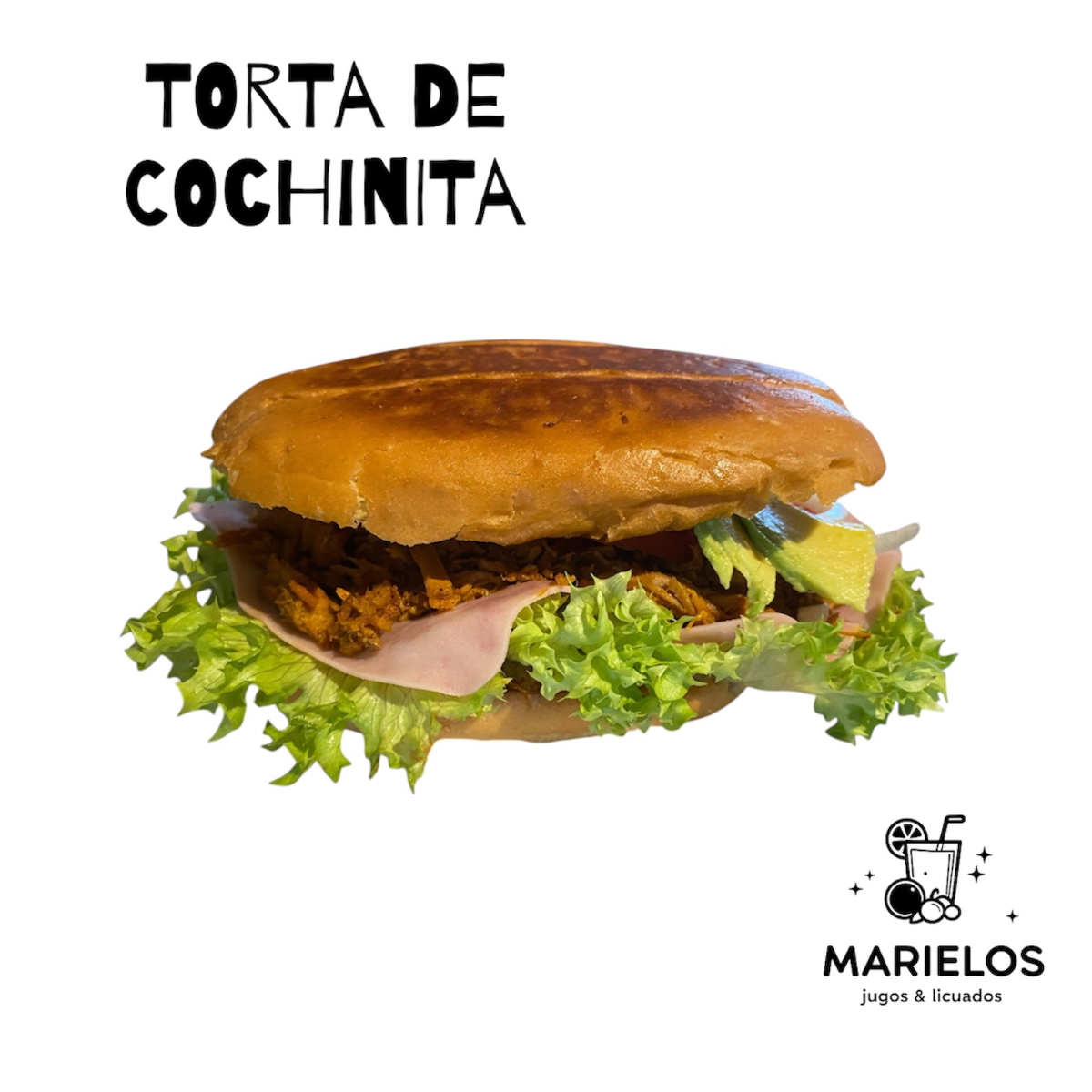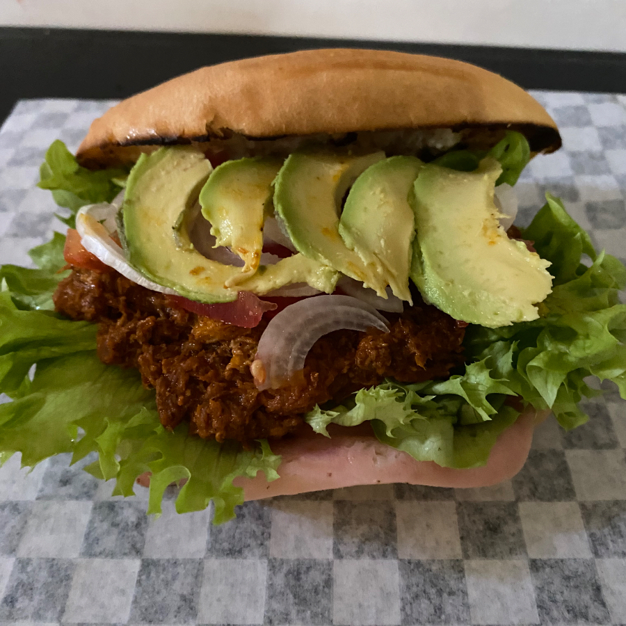 Torta de cochinita pibil con jamón, lechuga, tomate, aguacate, cebolla, mayonesa y mantequilla