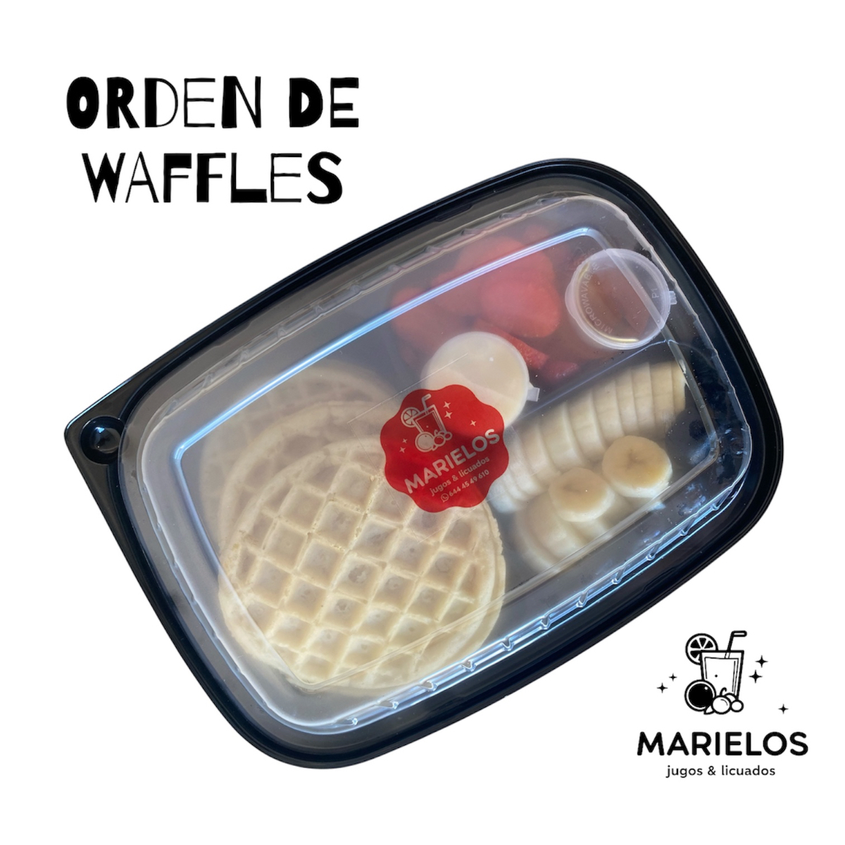 3 pzas de waffles acompañados de fresa, plátano, miel y lecherita