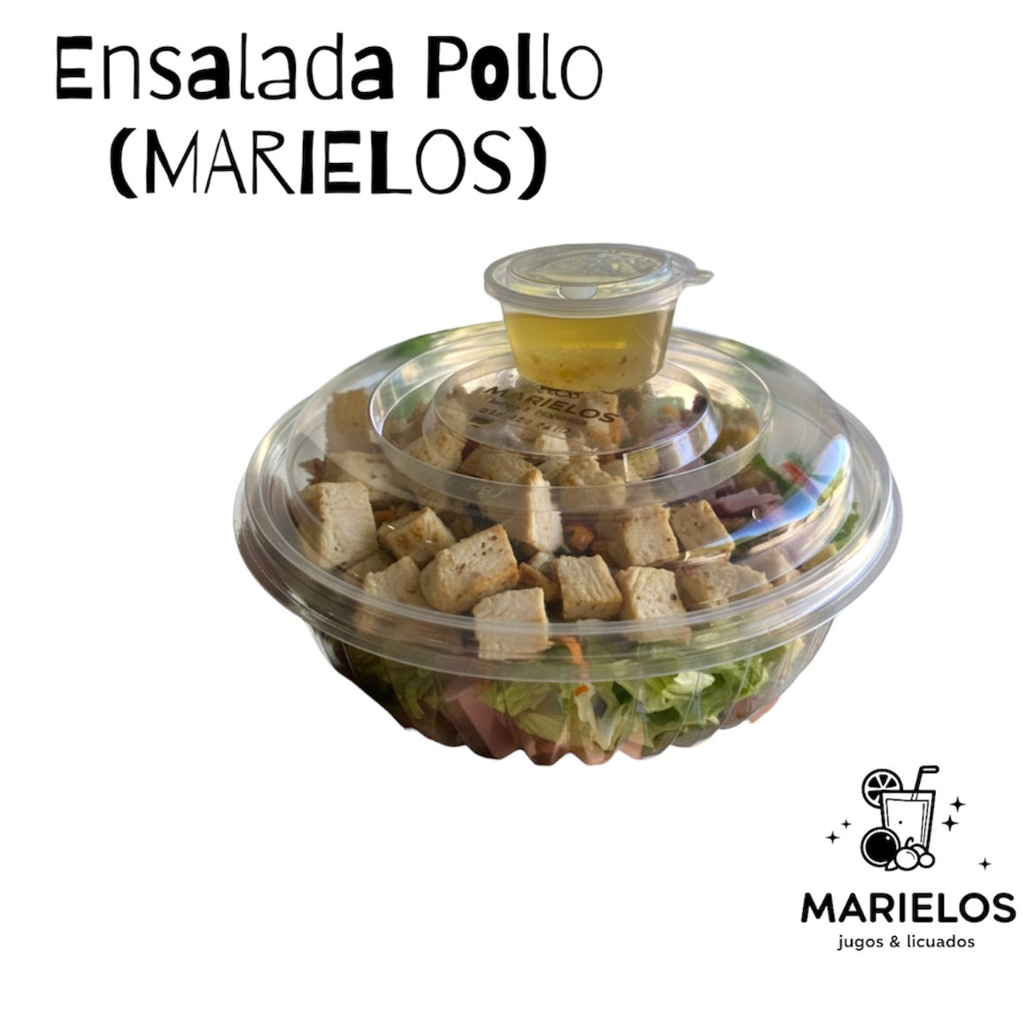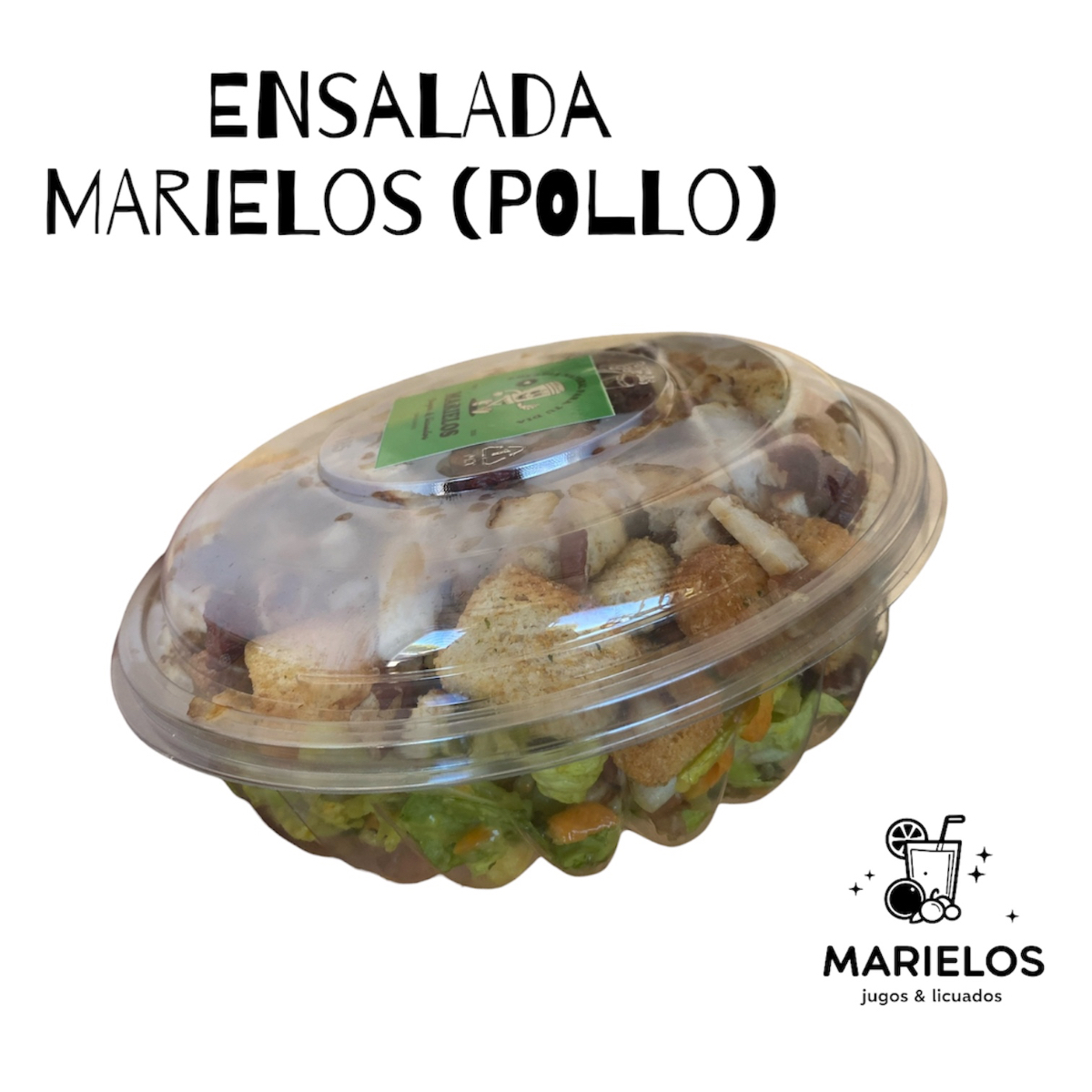 (lechuga, zanahoria rayada, pepino, manzana verde, arándano, nuez, pechuga de pollo y crotones)