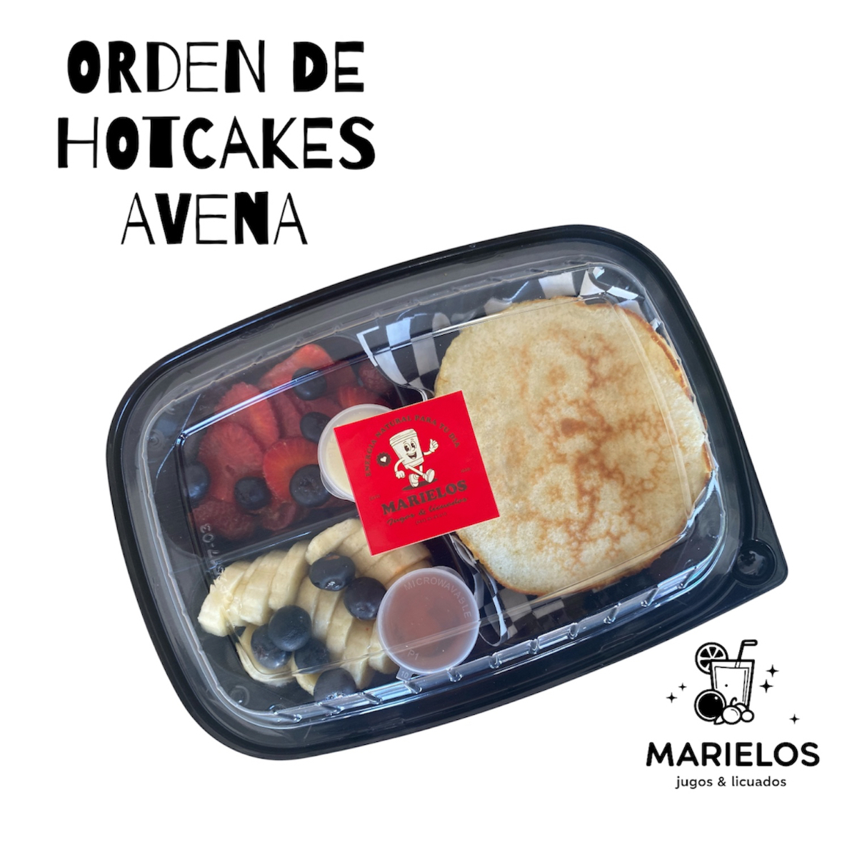 3pzas de hotcakes de avena acompañado de fresa, plátano y miel