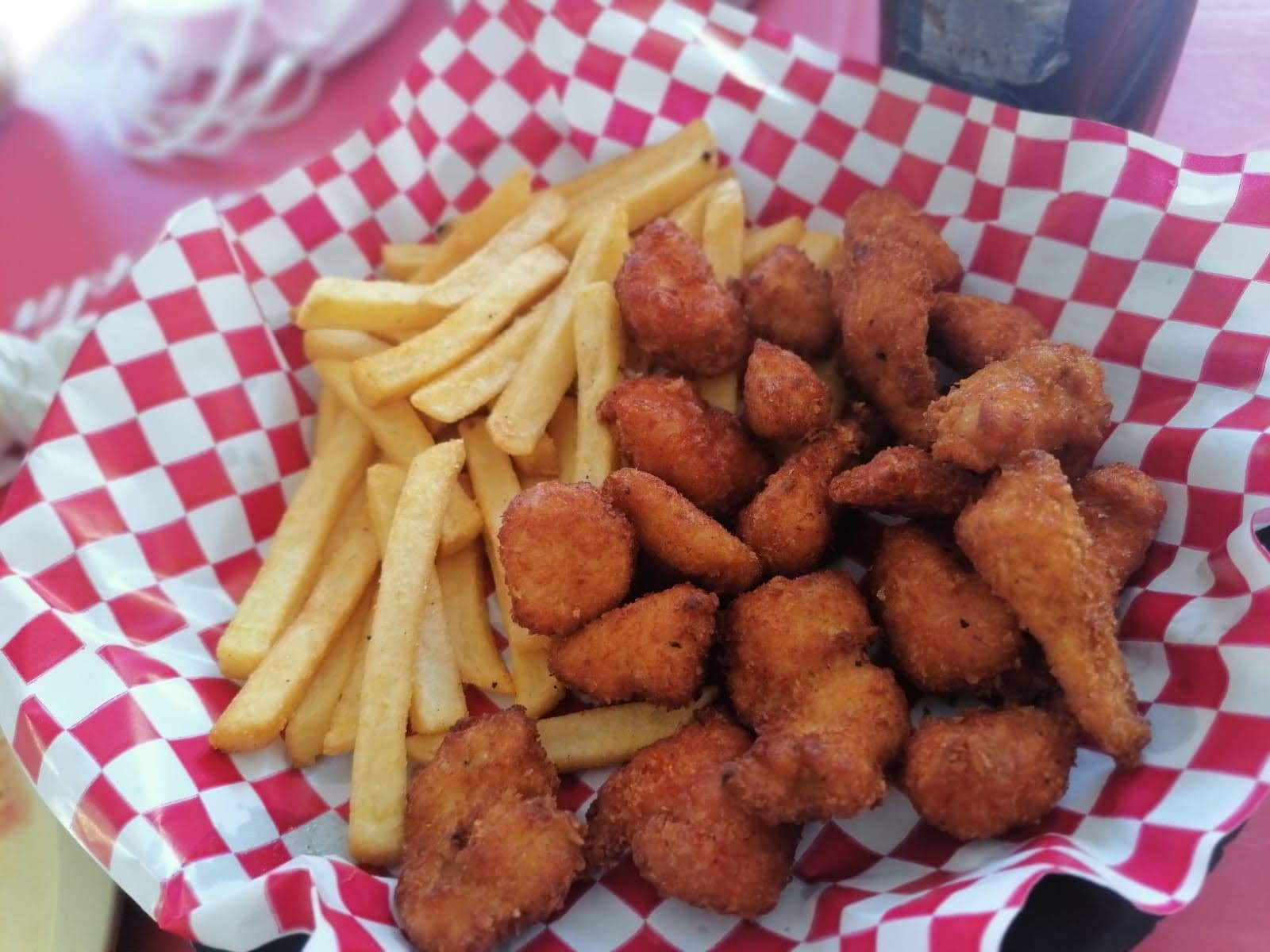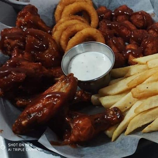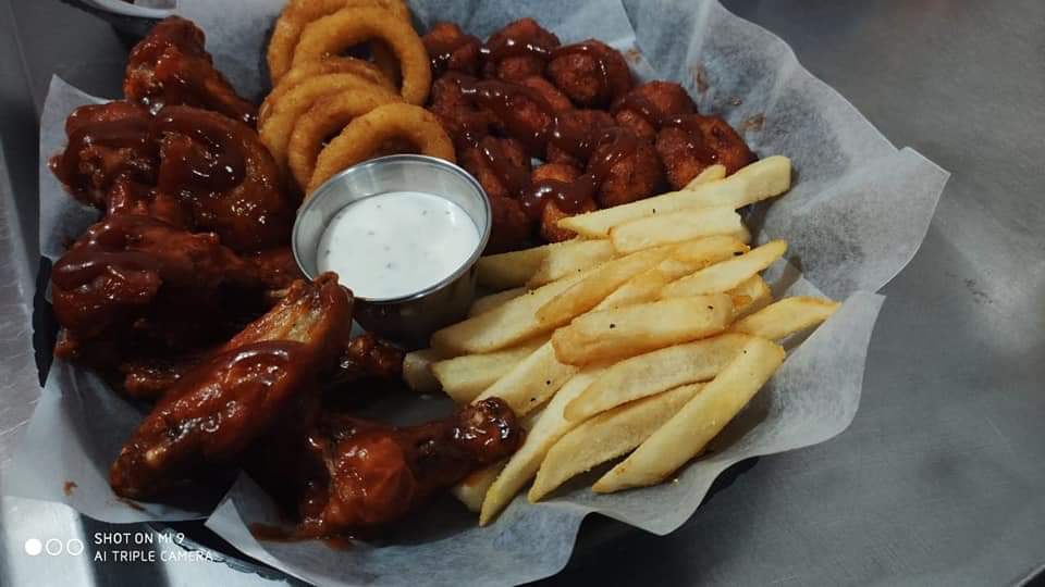 5 alitas, 1/2 orden de papas francesas y 7 aros de cebolla