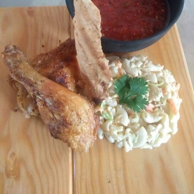 medio pollo asado incluye sopa fria, salsa y tortillas