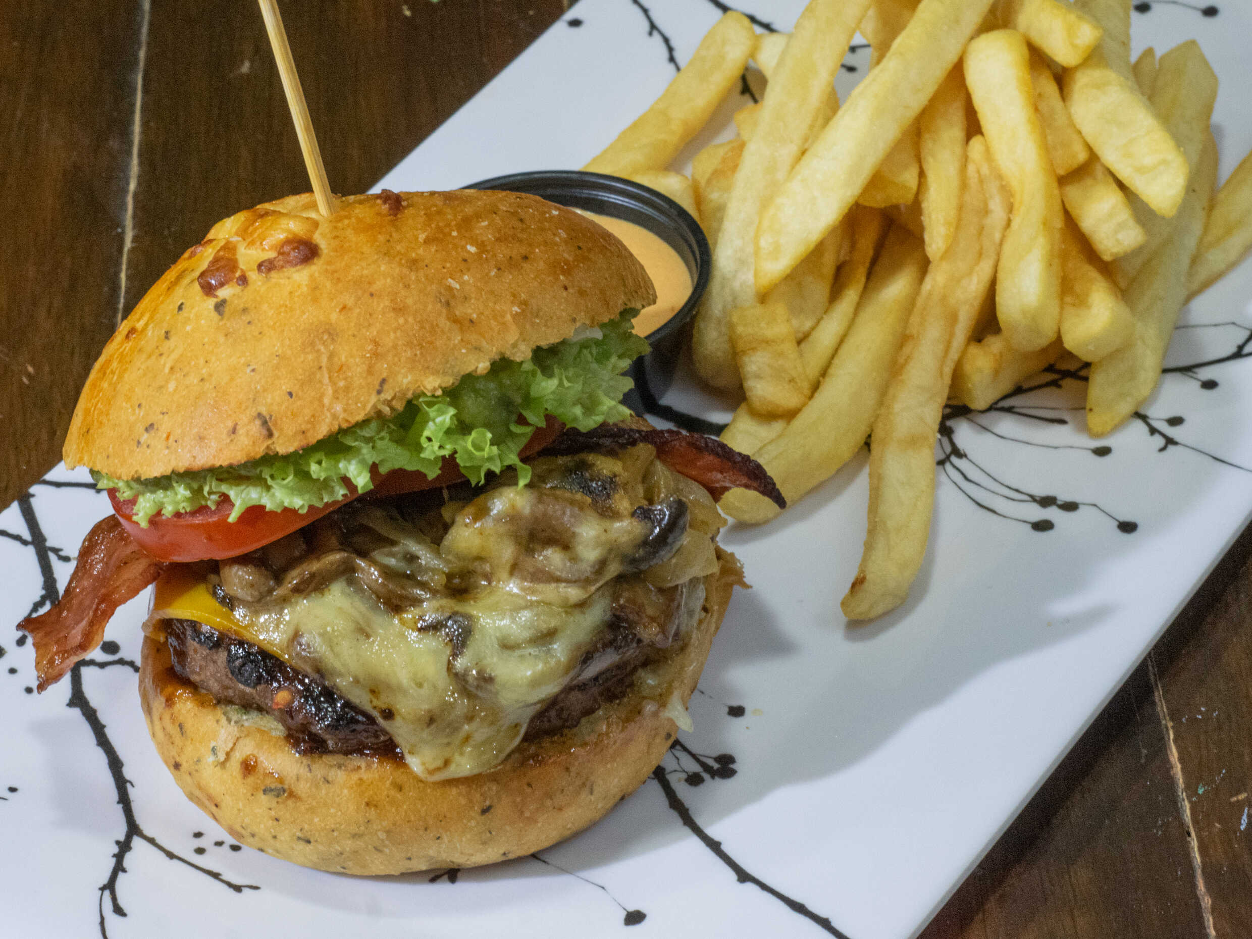 115 gr. de carne, jamón, queso gratinado, piña, cereza, tocino y aguacate. incluye papas.