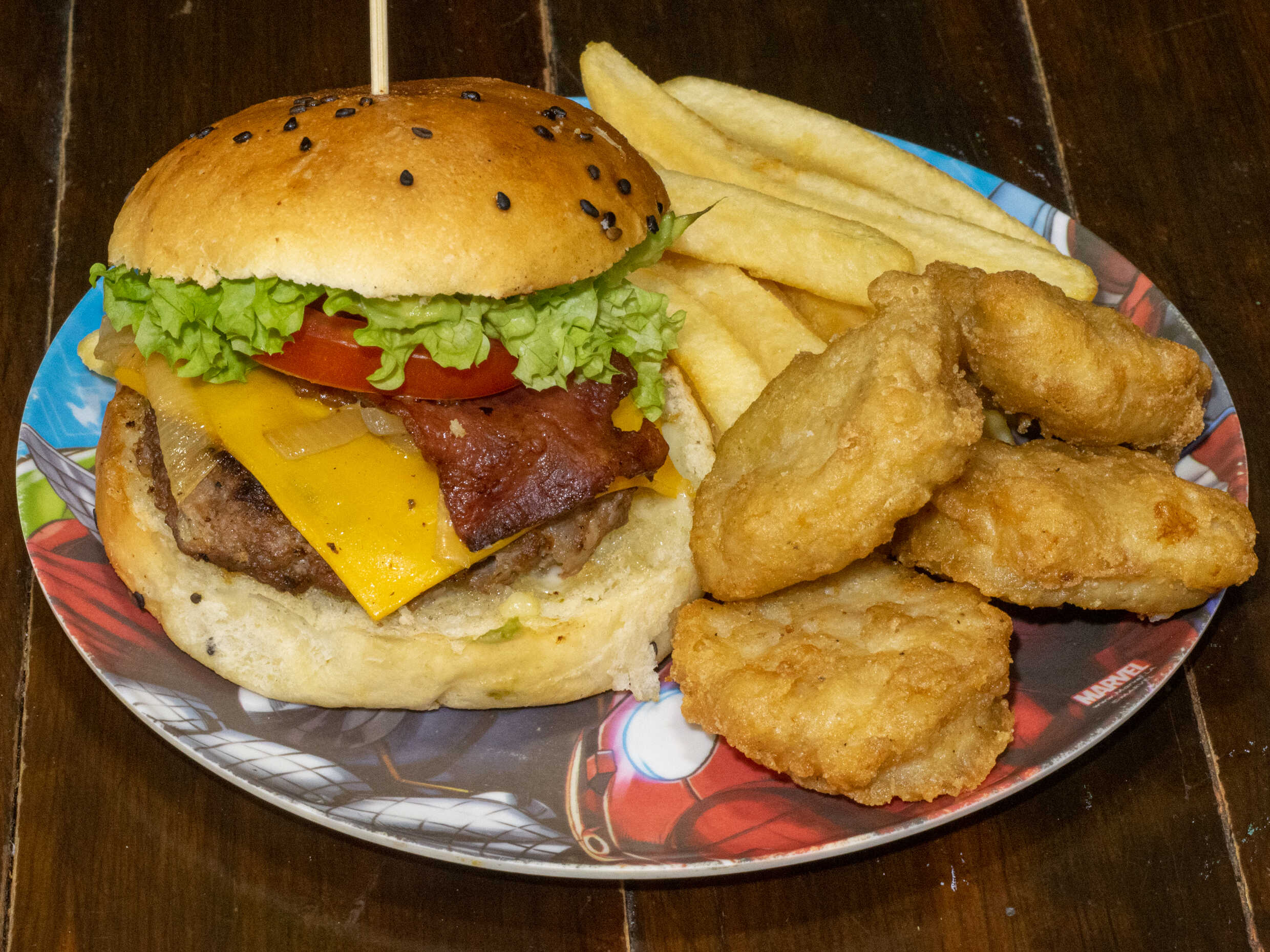 Hamburguesa a elegir, 5 pzas. de alitas, 100 gr. de boneless, 5 aros de cebolla, papas francesas y papas sazonadas.