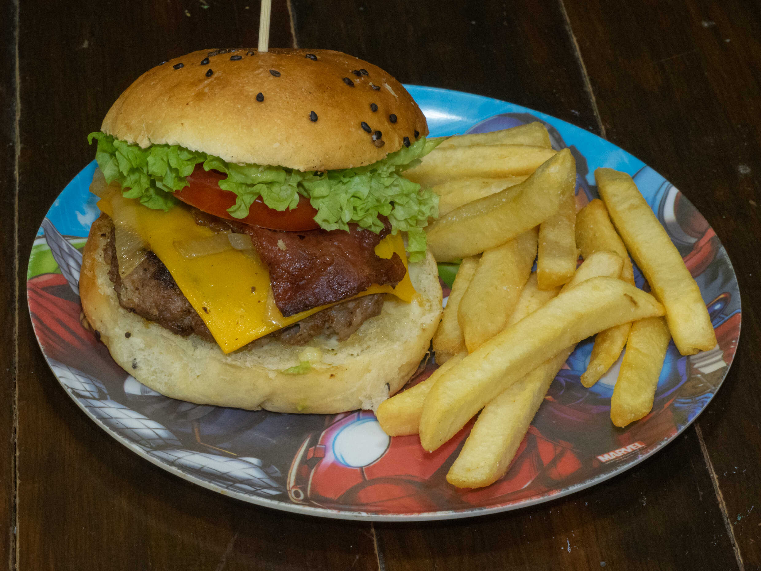 115 gr de carne, vegetales, tocino, aguacate, incluye papas francesas