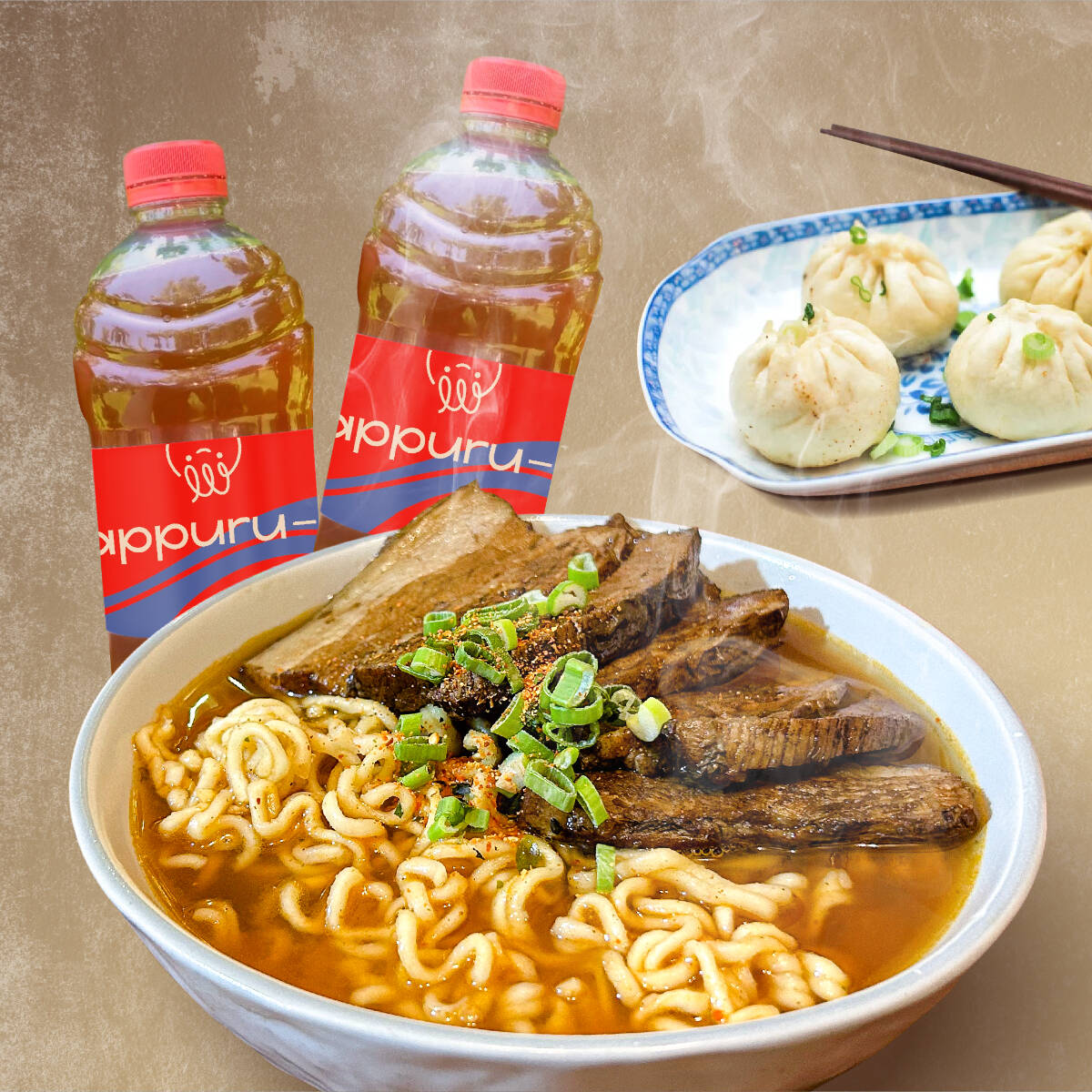 2 Spicy Ramen, 4 Dumplings y 2 Kappuru té