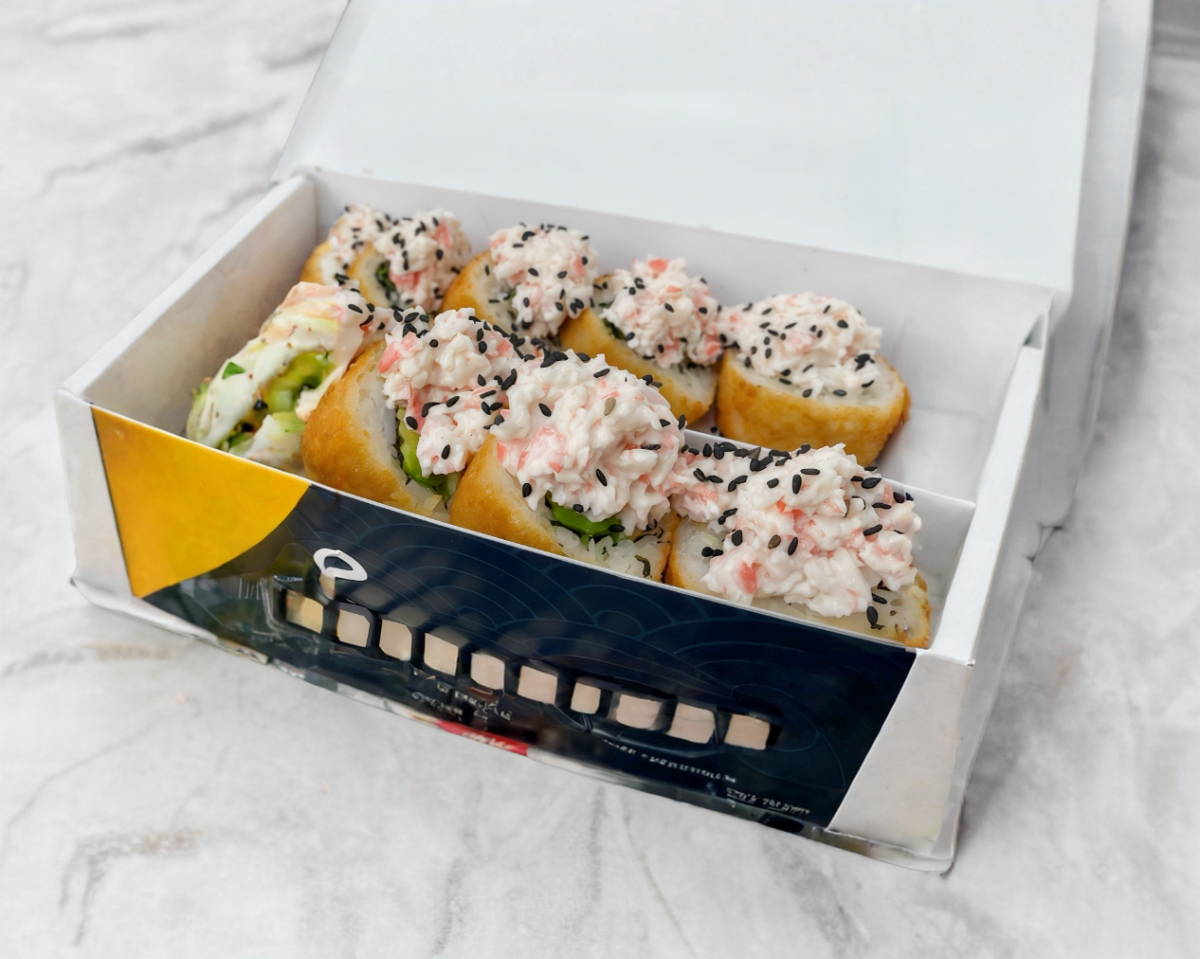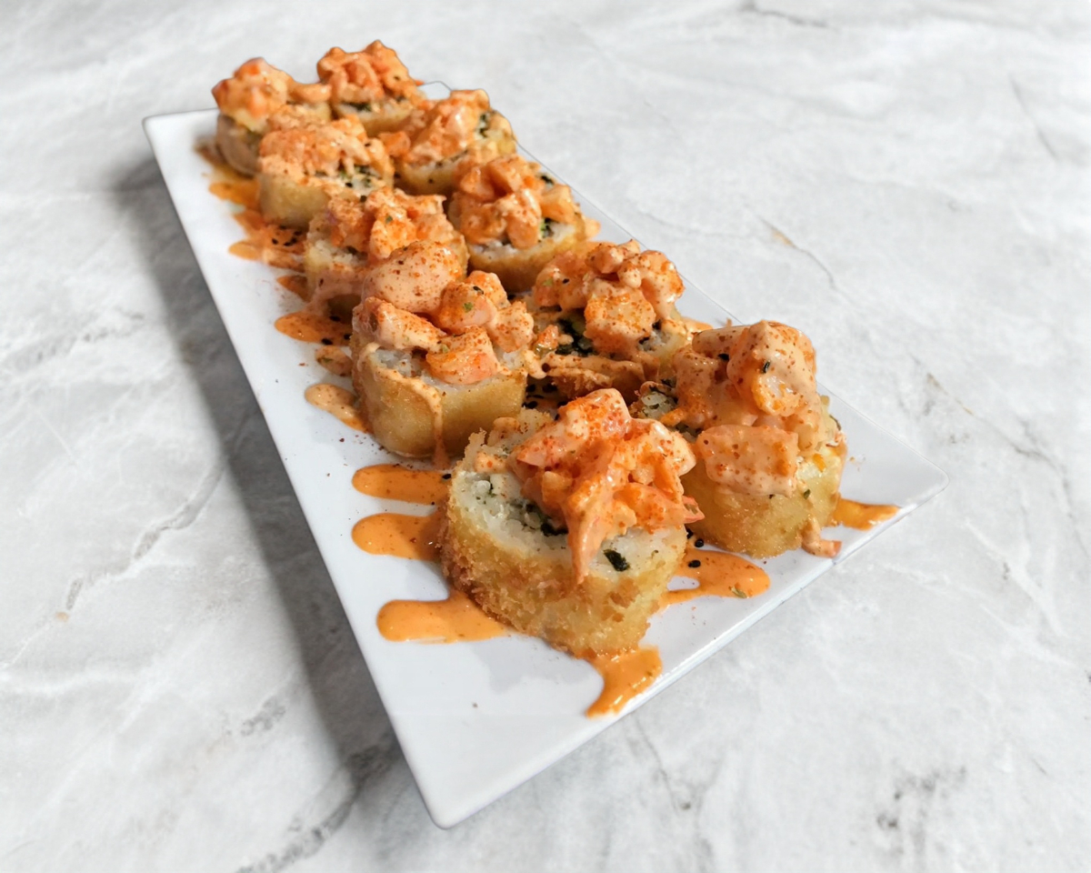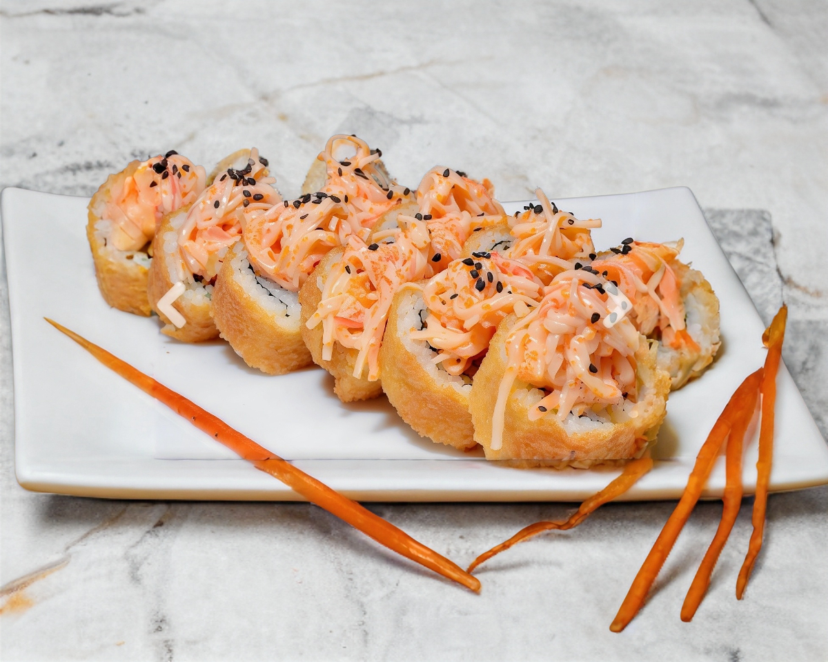 Sushi empanizado con Panko con topping de ensalada Tampico y salsa de anguila por dentro camarón o cangrejo , queso crema, pepino, aguacate