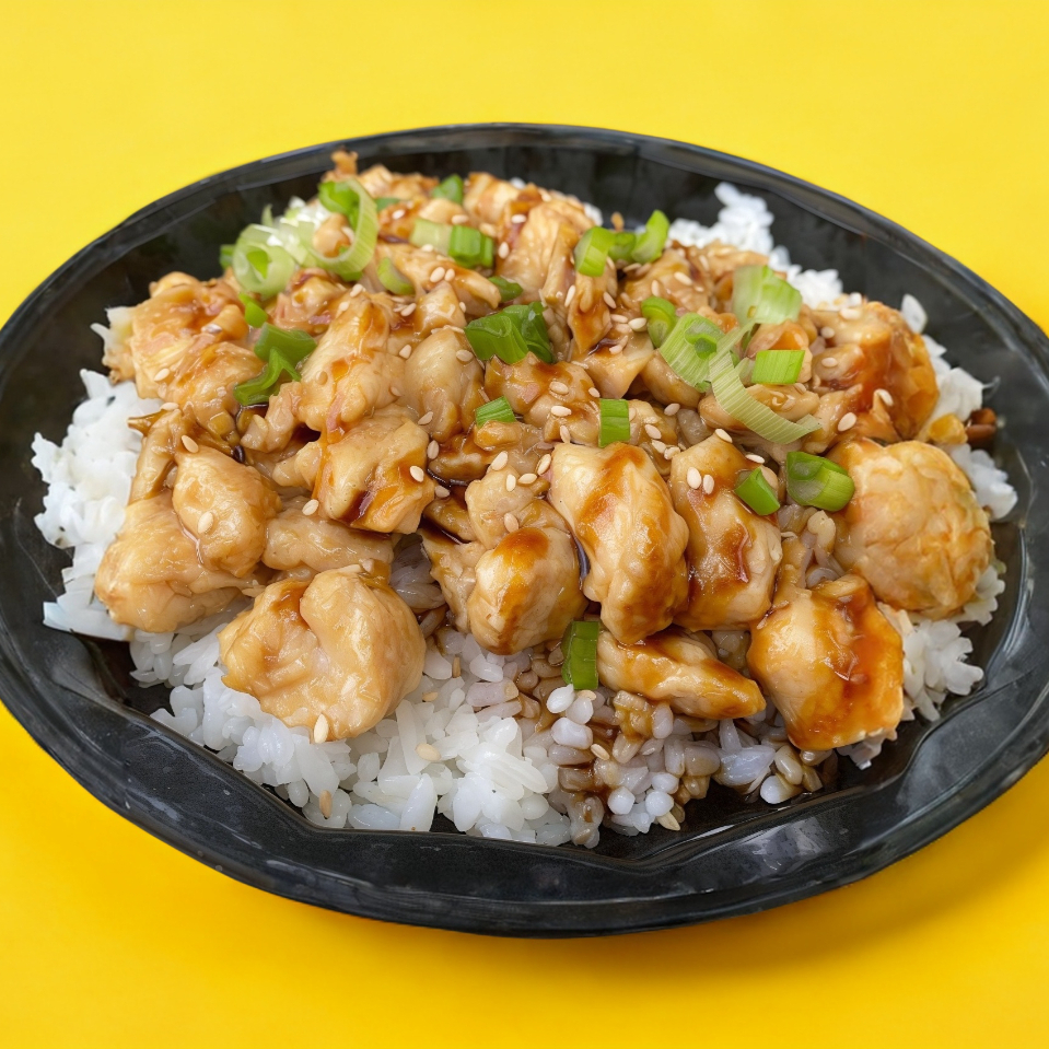 Gohan y pechuga de pollo 250gr en salsa teriyaki , cebollín y ajonjolí,ensalada tampico de 4 oz acompañado de salsa ponzu, salsa spicy y salsa de anguila