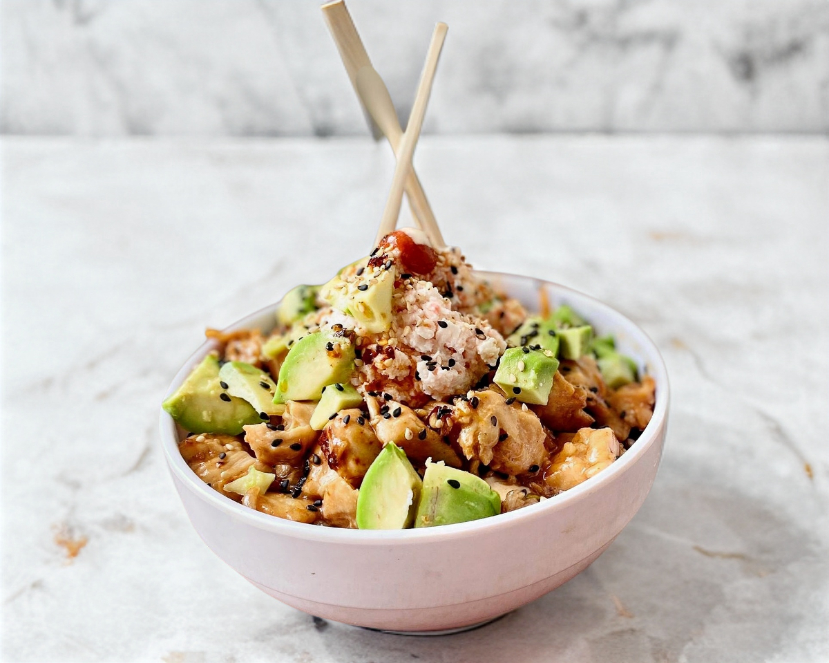 Tazón de arroz frito con vegetales cortados finamente y 250 gr de pechuga de pollo en salsa teriyaki y topping de ensalada Tampico, medio aguacate,queso philadelphia acpmañadp de salsa de anguila ,salsa ponzu y salsa spicy