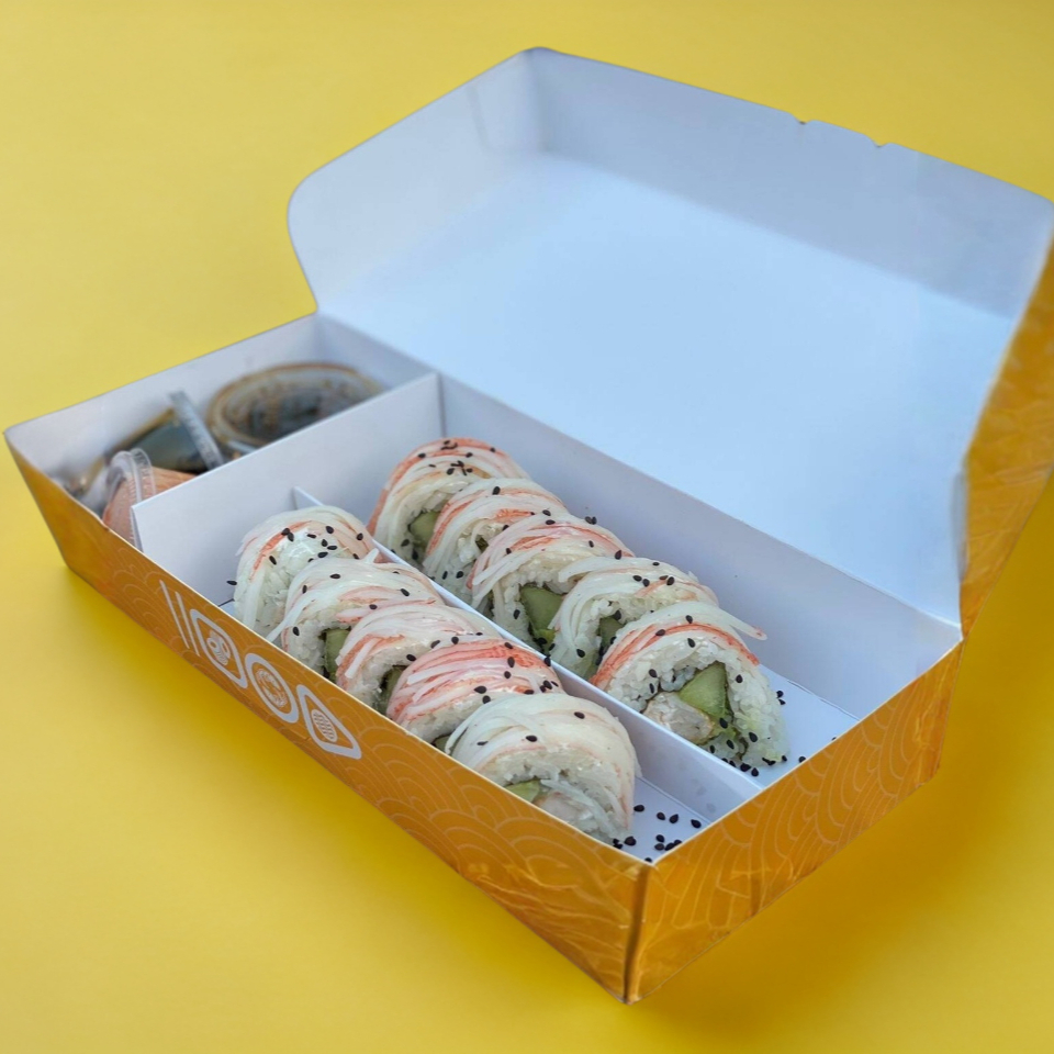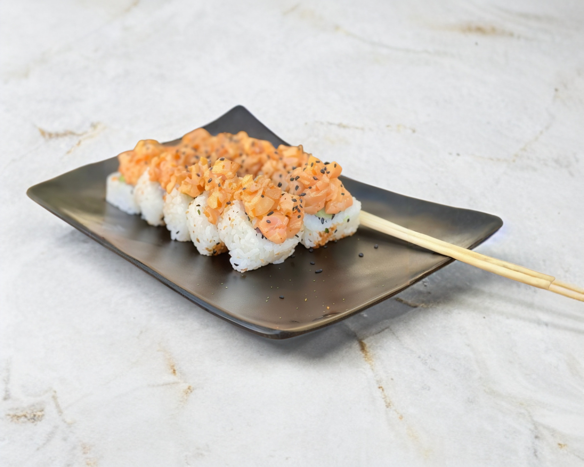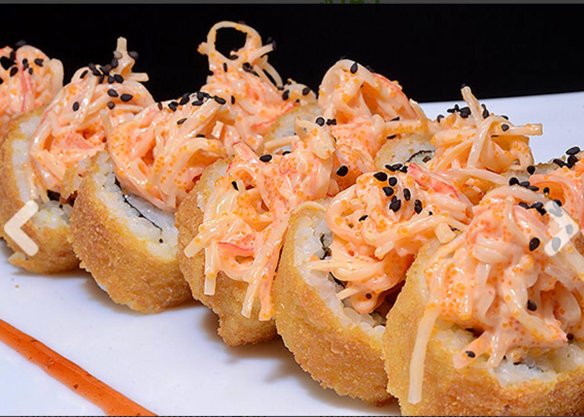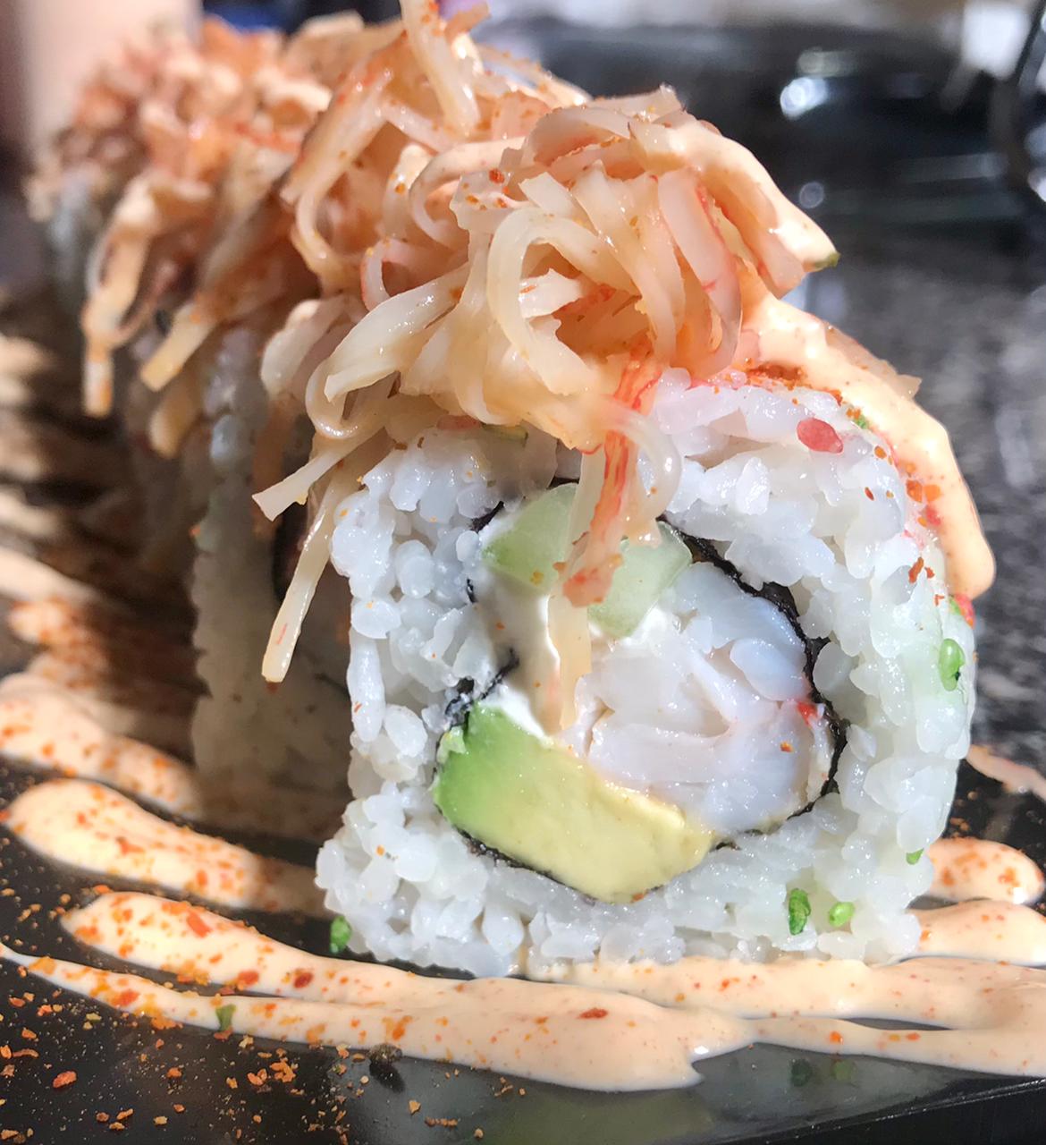 Sushi envuelto en la en kanikama con aderezo spicy y masago por dentro alga,surimi,aguacate, queso crema, pepino