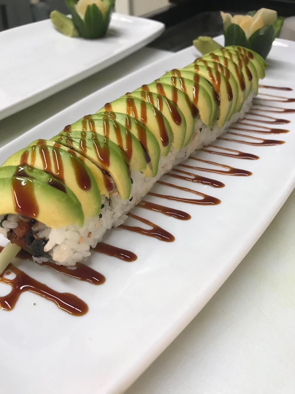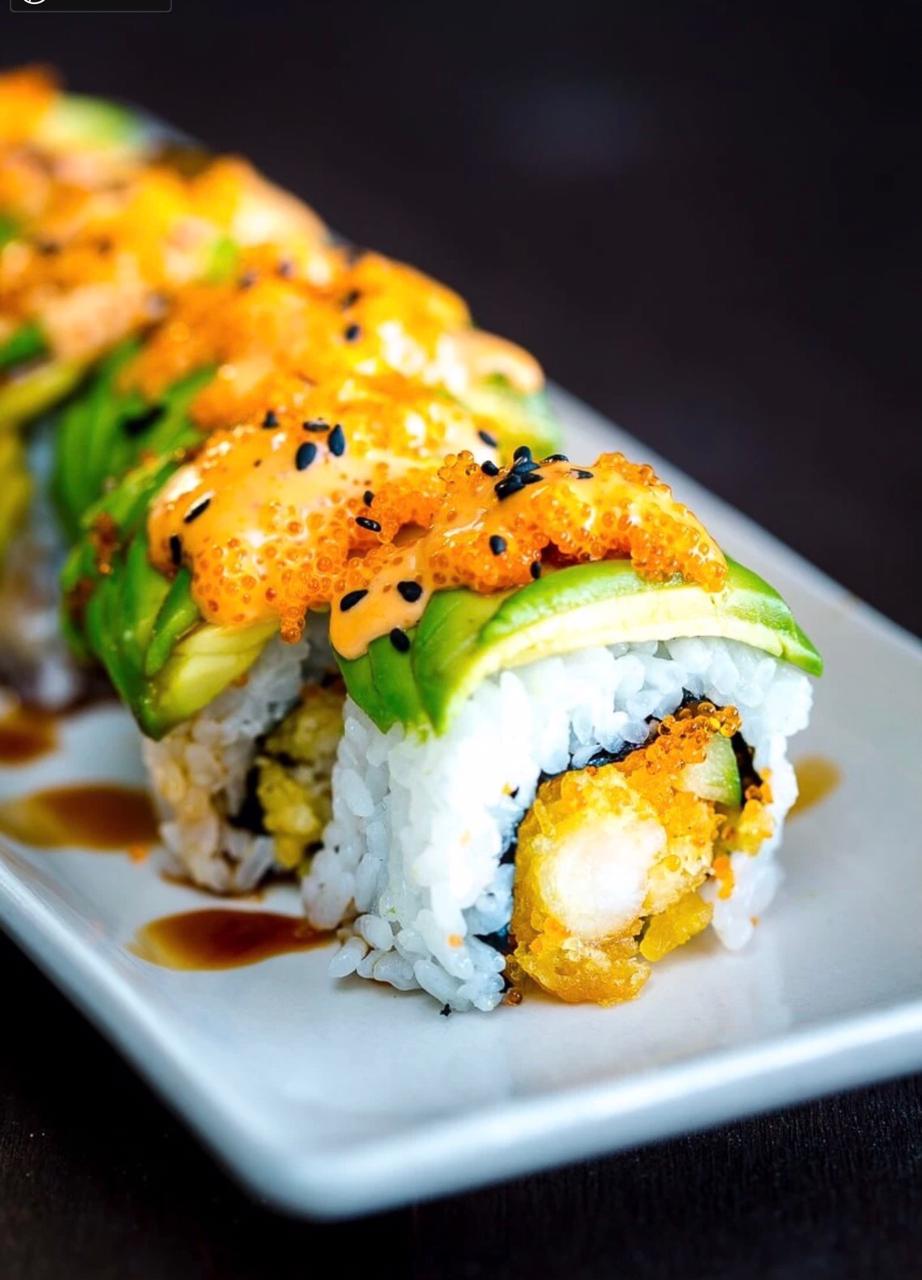 Sushi de aguacate por fuera adornado con ajonjolí y salsa unagui y por dentro Alga, ,cangrejo, queso crema, pepino