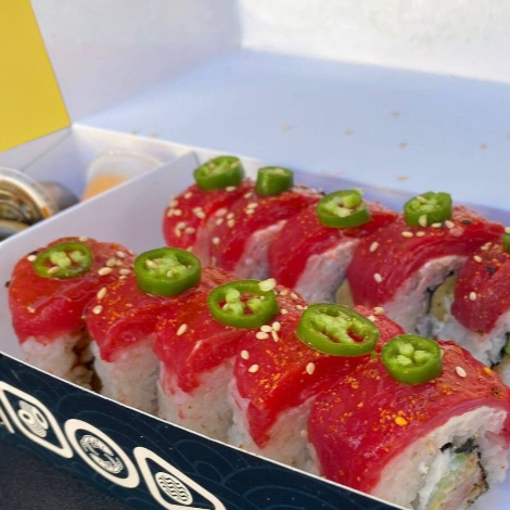 Sushi con a atún apor fuera con aderezo spicy Y rodajas de chicle serrano con salsa siracha por dentro camarón , aguacate , queso crema, pepino