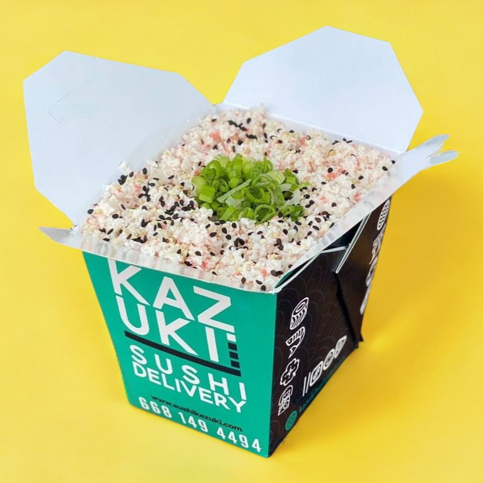 300 gr de arroz frito con 170 gr de pechuga de pollo aderezos,philadelhia,aguacate y ensalada de cangrejo acompañadp de slasa ponzu y cubiertos