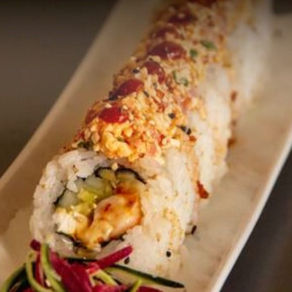 Rollo empanizado por dentro phila, aguacate , pepino y camarón, por fuera toping de ensalada tapico bañado en salsa de anguila y ajonjoli.