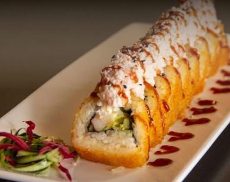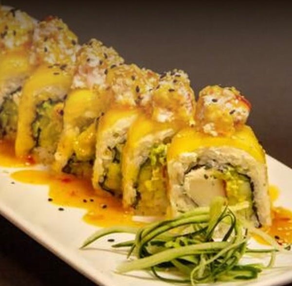 Rollo natural, relleno de cangrejo empanizado, queso philadelphia. Cubierto de philadelphia y plátano macho bañado en salsa de mango spicy y ajonjolí.