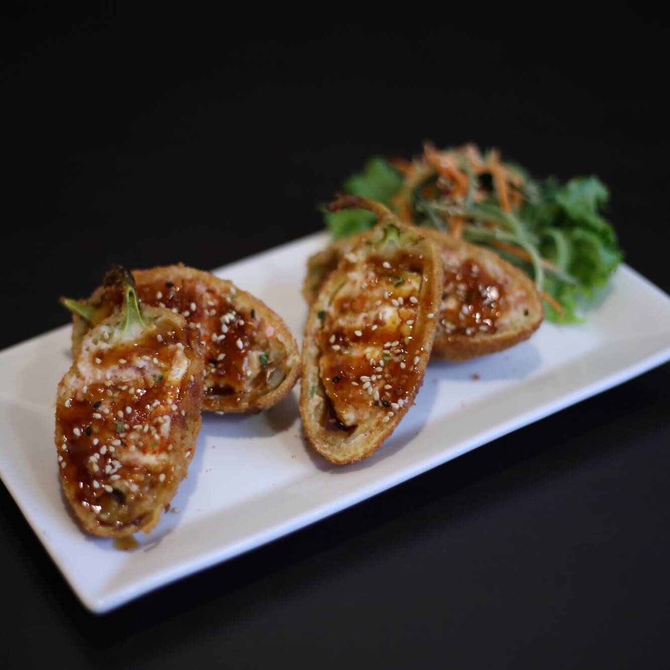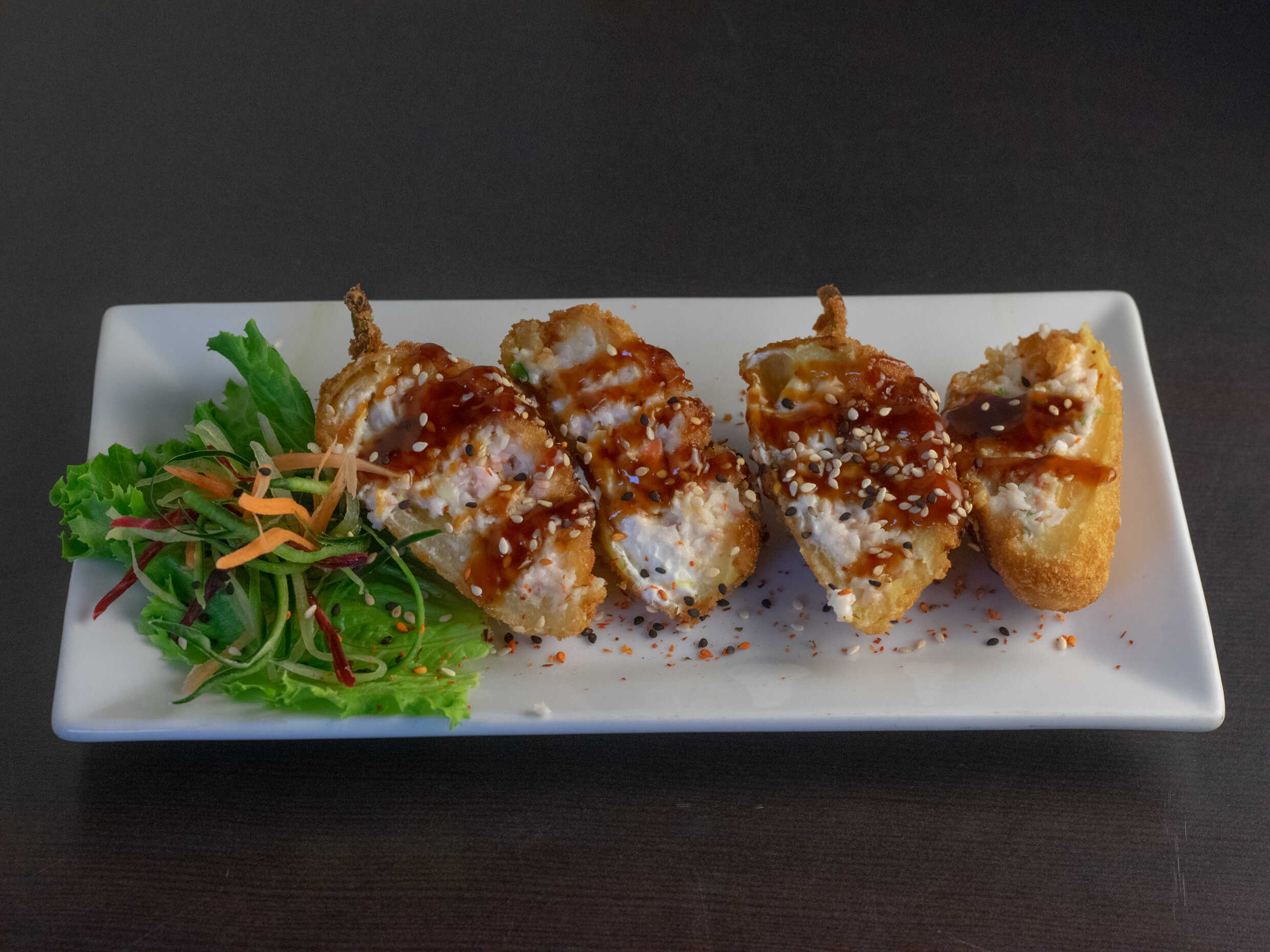Chiles caribes empanizados rellenos de philadelphia y ensalada tampico, bañados en salsa de anguila y ajonjolí.