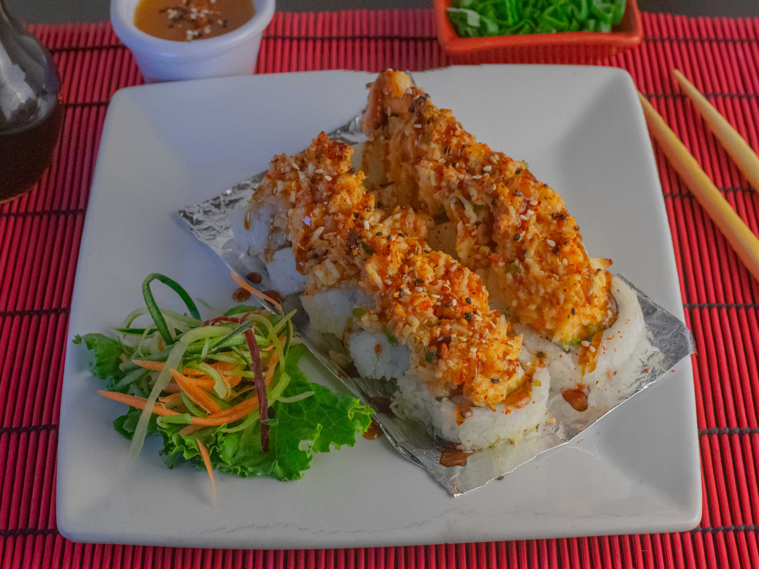 Empanizado, relleno de res, por fuera topping de ensalada Tampico, salsa de anguila y ajonjolí.