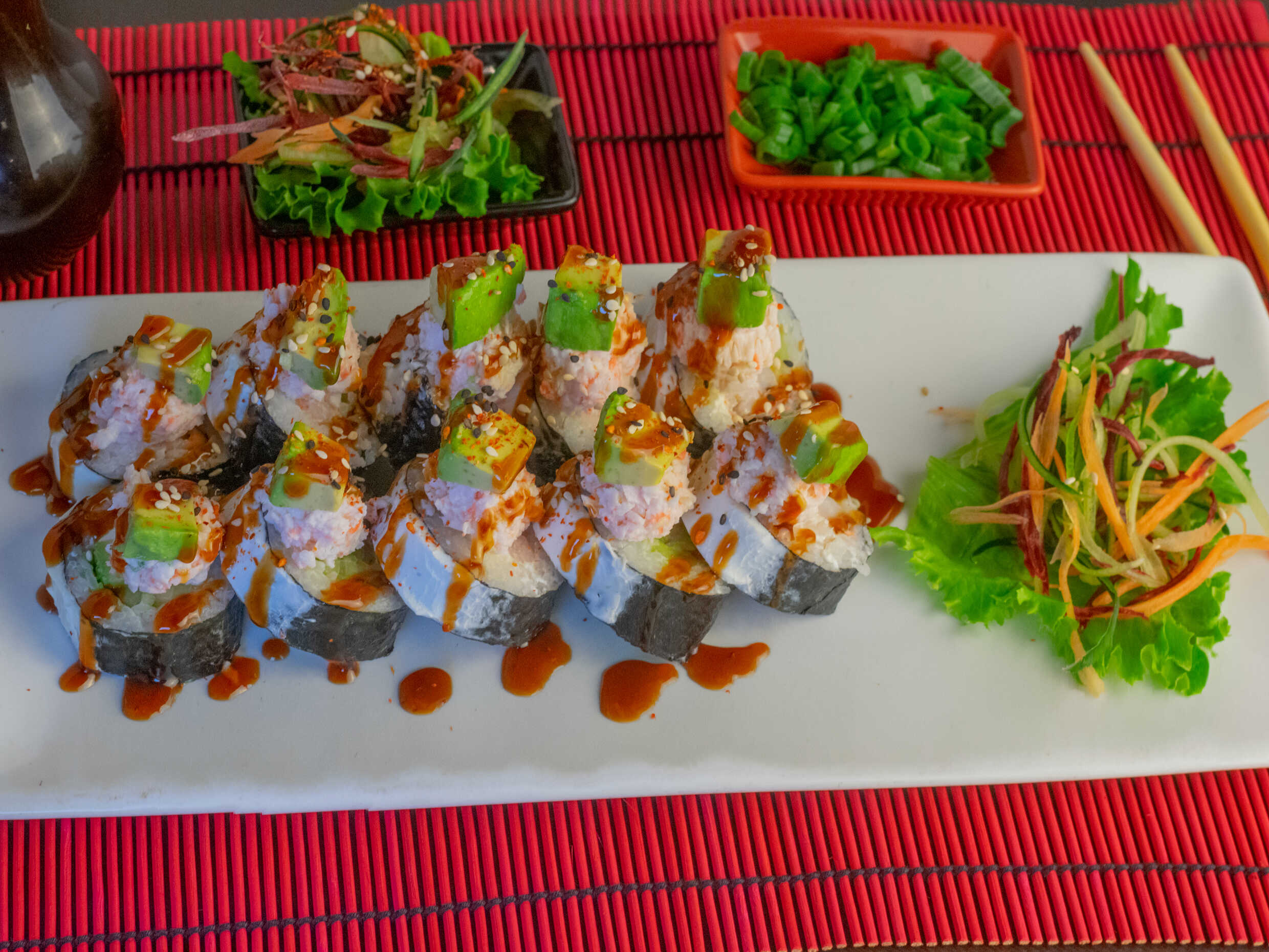 Por dentro cangrejo, queso, philadelphia,aguacate , por fuera toping de nuestra ensalada kani desmenuzada bañado en salsa de anguila y ajonjolí.