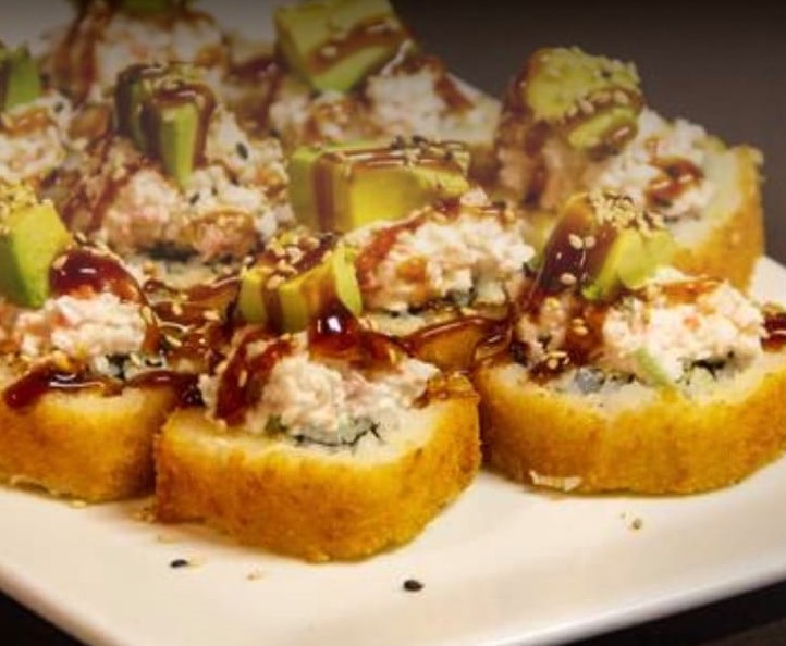 Bola de arroz empanizada, rellena de queso philadelphia, tampico, aguacate y el ingrediente a elegir, bañada en sala de anguila y ajonjolí,.