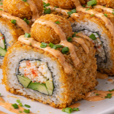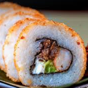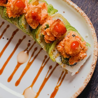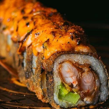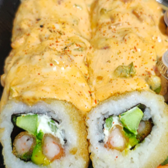 Por dentro: surimi, alga nori, queso crema, aguacate, pepino Topping: Camarón empanizado, aderezo spicy picoso, serrano, queso gratinado, cebollín y anguila.