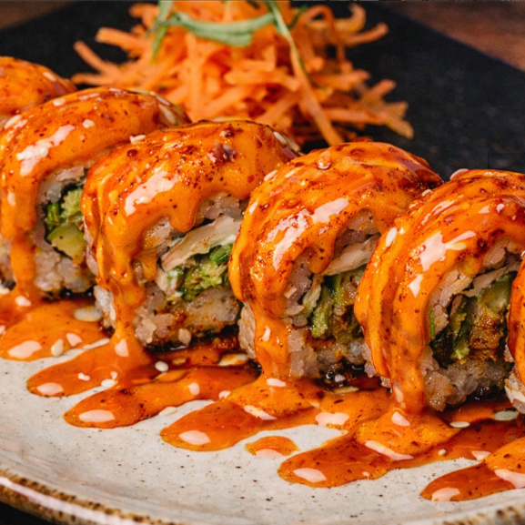 Por dentro: Camarón empanizado, alga nori, queso crema, aguacate, pepino Topping: Kanikama revuelto con aderezo spicy picosos, chile caribe, salsa de anguila y ajonjolí