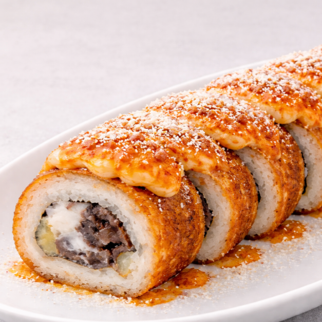 Por dentro: Carne de res, pollo, alga nori, queso crema, aguacate, pepino, queso americano, queso chihuahua, aderezo spicy, cangrejo preparado.