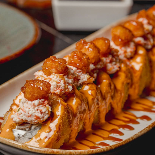 Por dentro: surimi, alga nori, queso crema, aguacate. Topping: Cangrejo preparado, camarón empanizado, anguila y aderezo spicy.
