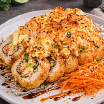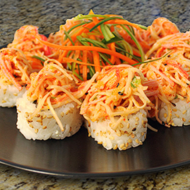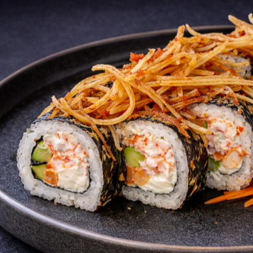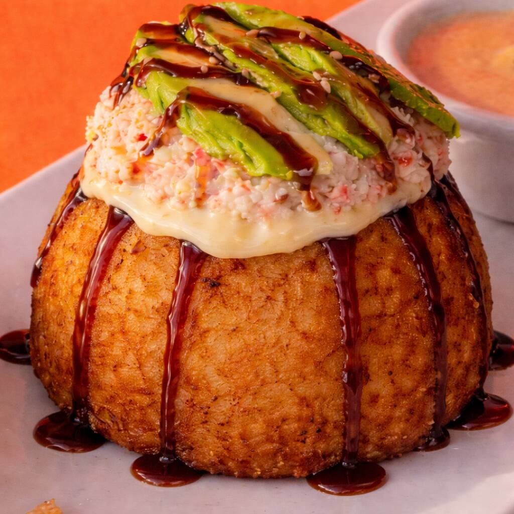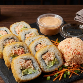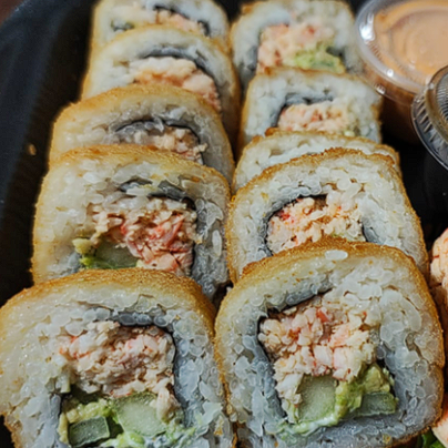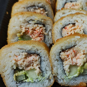 Por dentro: surimi, alga nori, queso crema, aguacate, pepino. Topping: kanikama frito, cangrejo preparado y aderezo spicy.